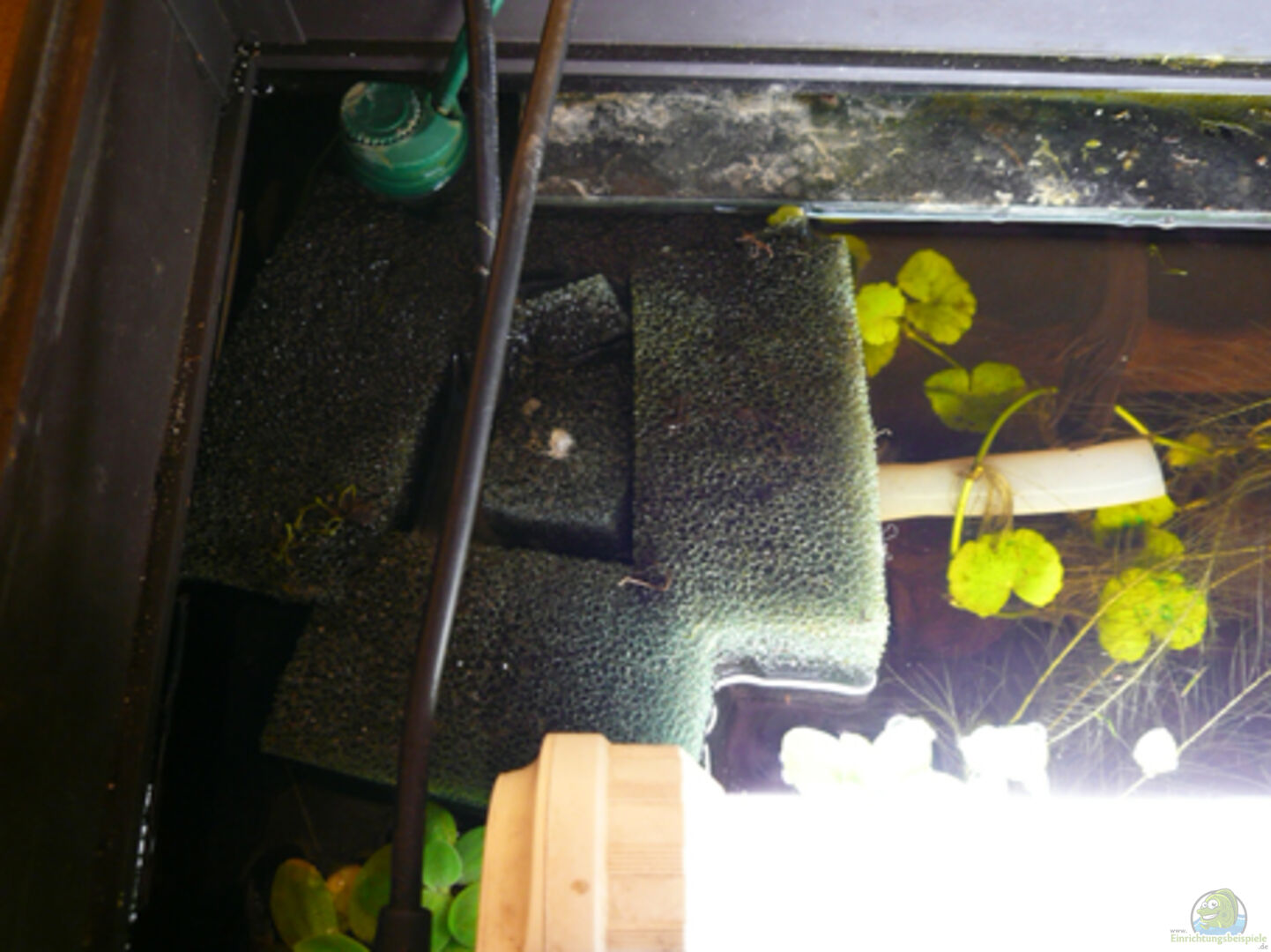 Ein Heizstab (Sera precision 150) mit 150 Watt Leistung heizt das Aquarium auf je nach Jahreszeit 26/30°C (Winter/Sommer) auf.