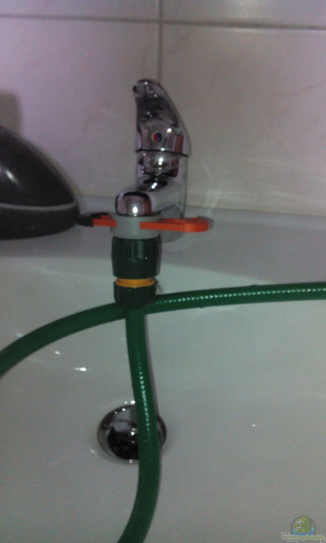 -Oberflächenabsaugung von Walther Aquaristik -Eheim Diffusor -Tunze Nanostream 6045 -Eheim Thermocontrol 250 Watt -Eheim Reeflex 500 UV-C Klärer Zum Wasserwechsel benutze ich eine ProFlow 500. Auf deren Auslauf steckt ein 1/4 Zoll Schlauch, den ich je nach Jahreszeit in den Garten oder in´s Bad legen kann. Die Pumpe henge ich wie eine Tauchpumpe ins Becken, Stecker in die Dose und los geht´s. Um das Becken wieder zu befüllen, hab ich mir einen Gardena Adapter für Innenwasserhähne [...]