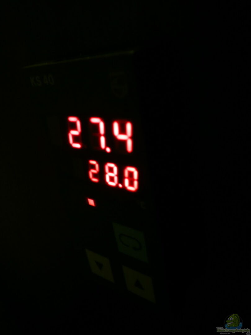 Heizmatte als Hauptheizung des Beckens, eingestellt auf etwa 27°C __ Geheizt wird über eine Heizmatte. Die hat gelegentliche Aussetzer, sodass Temperaturschwankungen, im Winter von mehreren Grad Celsius, entstehen können. Ansonsten ist die Matte zuverlässig und macht den Pflanzen ein bisschen warme Fü??e.In der Regel herrschen so um 26°C im Becken.