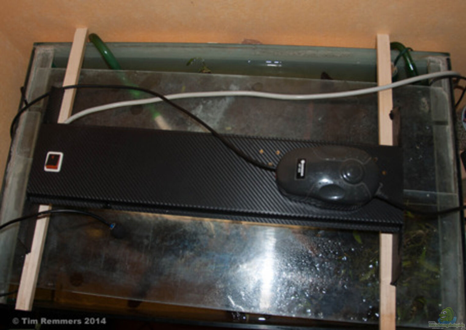 Ein 150 W Heizstab von Sera sorgt für kuschelige Temperaturen im Becken Eine Tunze nanostream 6015 mit 1800 l/h Zwei Diffusoren ist in Arbeit, bis zur Fertigstellung sorgt tagsüber eine Membranpumpe mit Sprudelstein für ausreichend Sauerstoff.