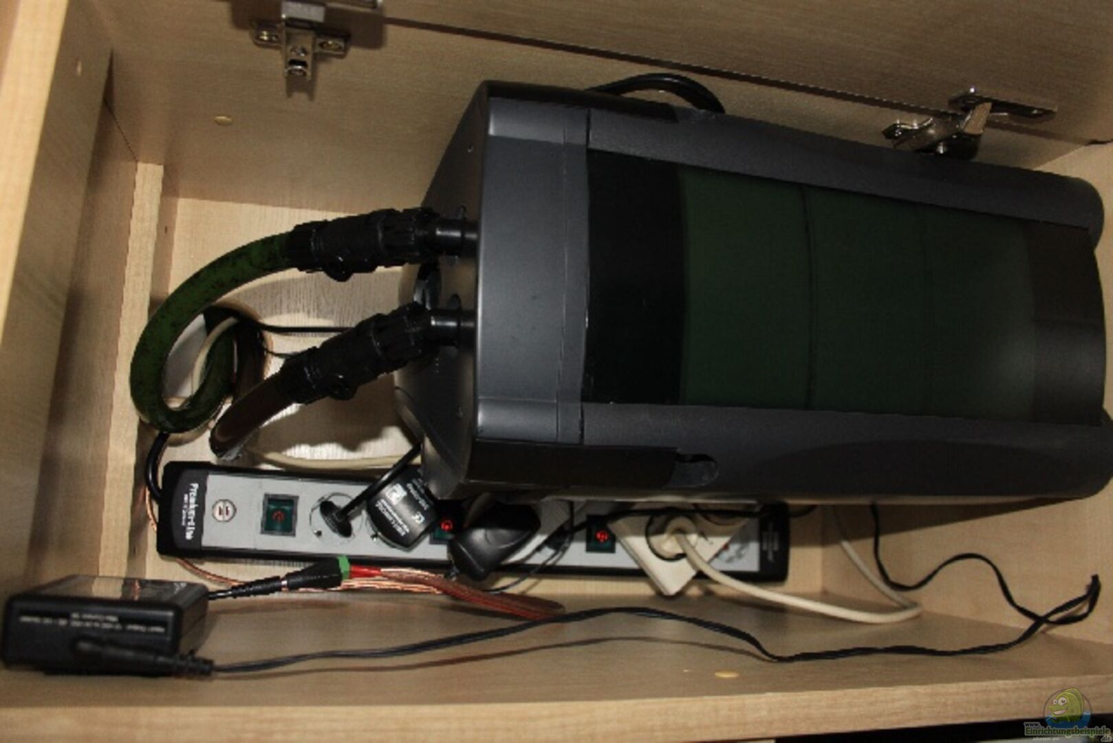 Heizstab von Jäger 150 W, Heizzeit 8:00 - 22:00 Uhr, im Sommer wird die Heizung abgeschaltet. Brennenstuhl ProfiLine 6-Fach Verteilerleiste, je zwei schaltbar Digitalthermometer Europet Bernina 227 mit externen Fühler Drei Zeitschaltuhren (Mondlicht, Heizer und Strömungspumpe) Ein ??berlaufrohr mit Gardenahahn und -anschluss für den Wasserwechsel