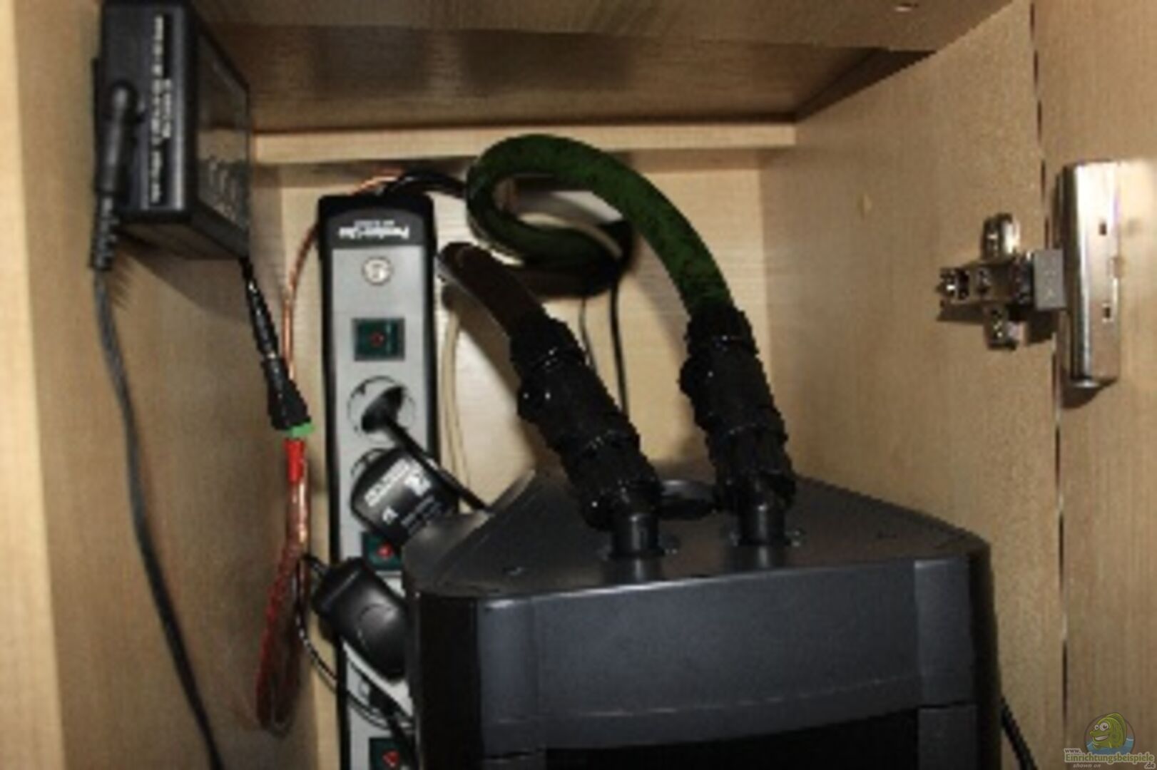 Heizstab von Jäger 150 W, Heizzeit 8:00 - 22:00 Uhr, im Sommer wird die Heizung abgeschaltet. Brennenstuhl ProfiLine 6-Fach Verteilerleiste, je zwei schaltbar Digitalthermometer Europet Bernina 227 mit externen Fühler Drei Zeitschaltuhren (Mondlicht, Heizer und Strömungspumpe) Ein ??berlaufrohr mit Gardenahahn und -anschluss für den Wasserwechsel