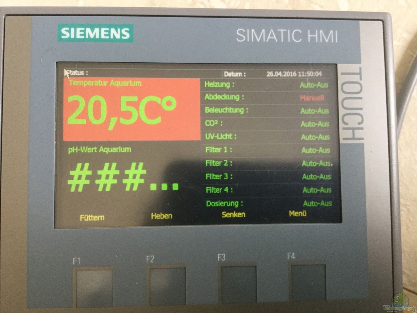 1x Siemens SPS mit Touchpanel 1x 300 Watt Heizstab, der nur für den Notfall vorgesehen ist. 2x 2kg co2 mit Nachtabschaltung 1x Knick pH-Messgerät mit Analogausgang 1x Rolladenmotor 4x elektrische Ventil, für automatischen Wasserwechsel. 6x Flowsensor 0- 1000l/min