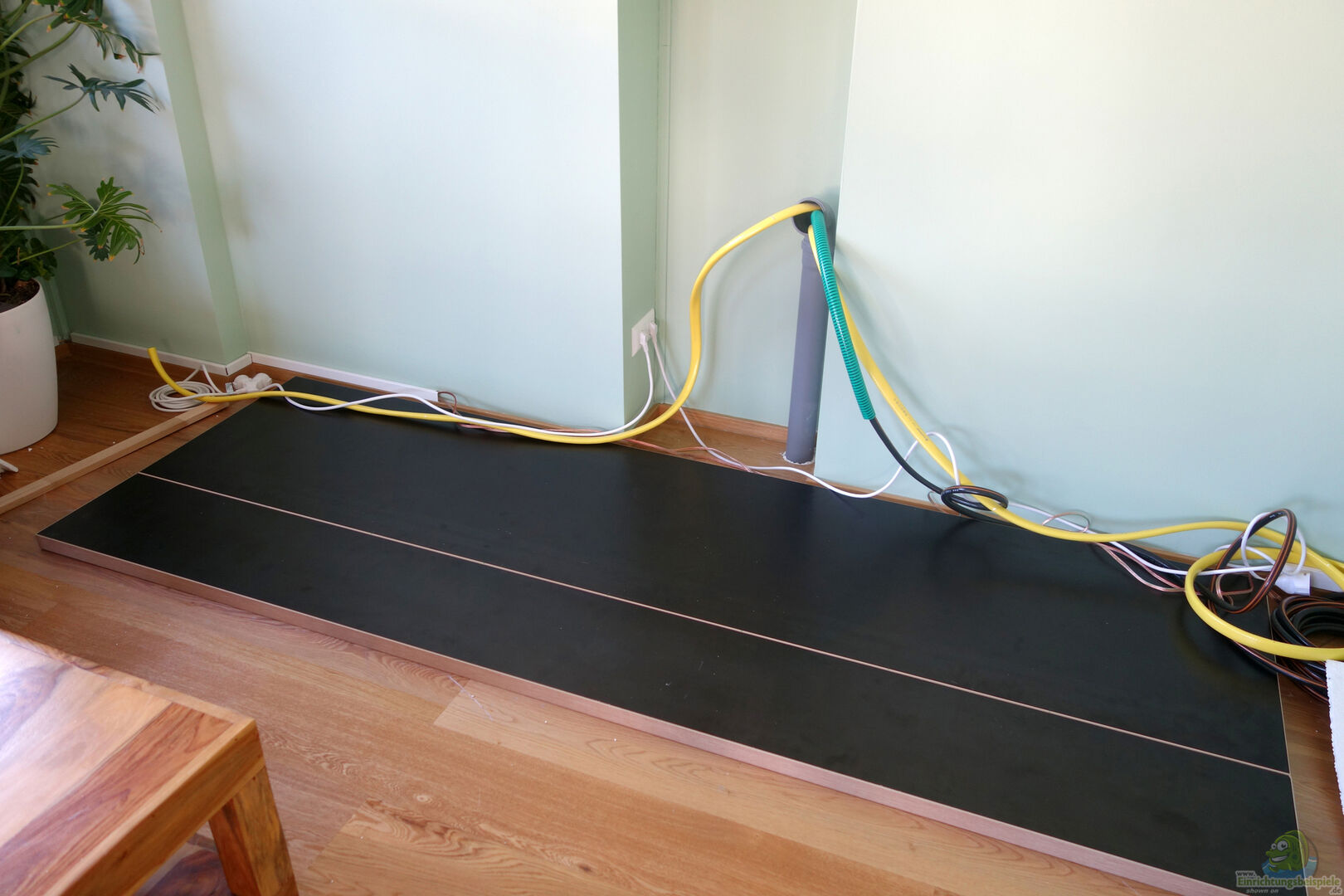 600 GPD Osmoseanlage mit 450Liter Wasserspeicher im Keller, Schlauchführung in das Wohnzimmer in der Nische hinter dem Becken, halbautomatischer Wasserwechsel über die Schlauchführungen (Zu- und Abwasser) im Keller. CO2 Anlage 5w Strömungspumpe Bodenheizung, 500w Stabheizer in der Schmutzwasserkammer des Filters.