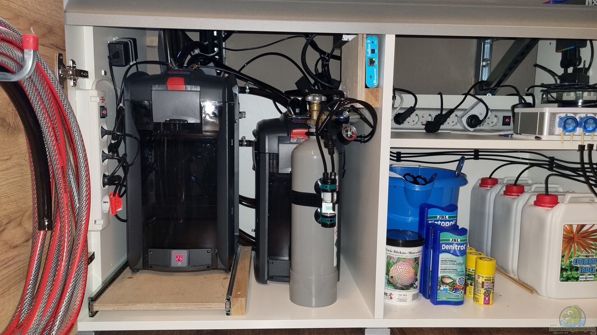 1x GHL-Doser 2.1 Dosierpumpe zur automatischen Düngung 1xCO²-Anlage mit Nachtabschaltung 1x JD-Aquatec CO²-Reaktor mit integriertem Bypass 2x Futterautomat Eheim Autofeeder 1x UV-Klärer Eheim reeflexUV 350 1x OASE CrystalSkim 600 Oberflächenabsauger 1x Osmoseanlage Profiline X3 600 GPD + Harzfilter für den Wasserwechsel