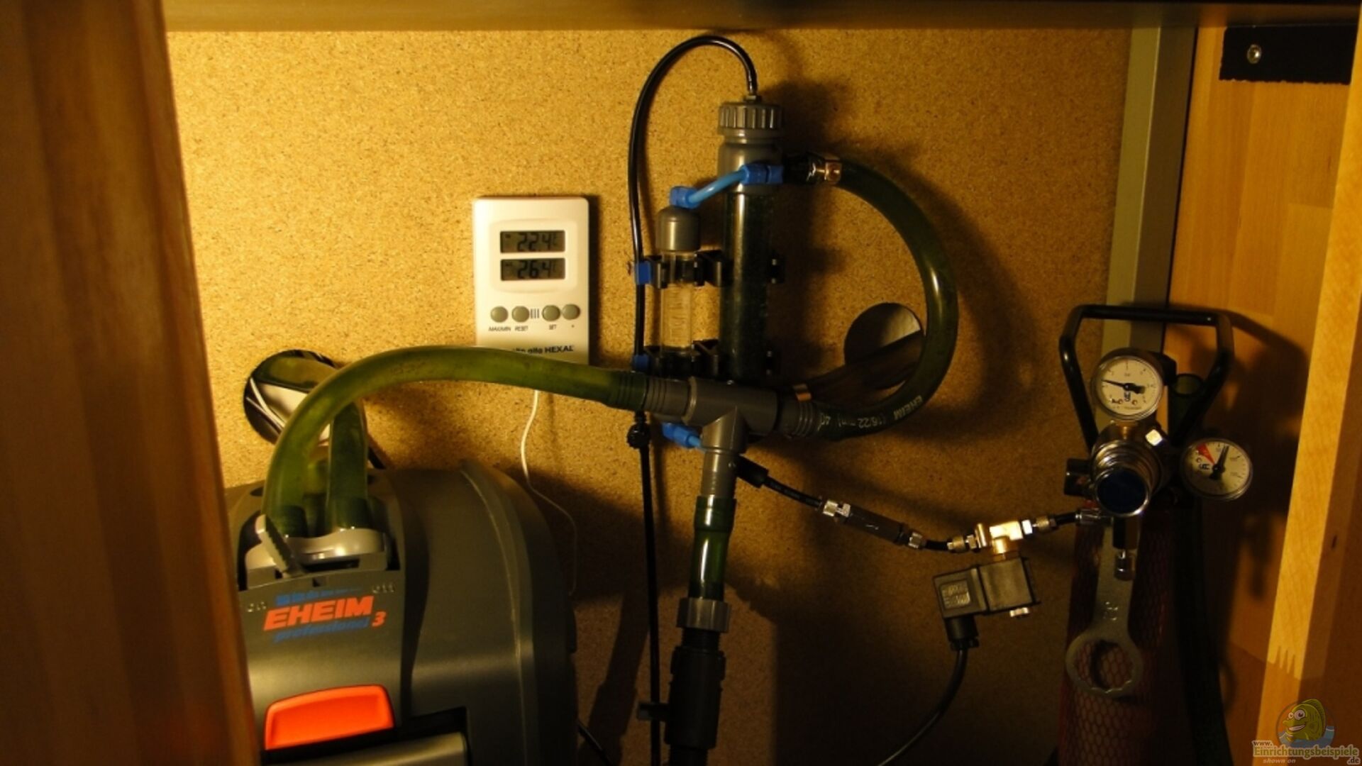 Co2 Anlage mit Au??enreaktor (Nanojet) von US. Aquaristik, musst leider adaptiert werden (verminderter durchfluss), da der Au??enreaktor für DN32 jedoch hat meine Eheimpumpe DN40 Schläuche. 500g Flasche Nachtabschaltung etwa 12-15 Blä??chen pro Minute ------ Torfkanone für Wasserfilterung und Schwarzwasserfärbung. Benutzt wird Floragard Hochmoortorf (Unbehandelt) --- Zusätzliche Osmose-Anlage in Planung