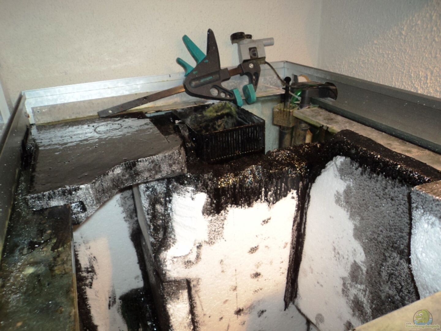Erst mal zu dem Felsen. Der Felsen ist aus 5 Tonröhren gebaut und steht auf einer 1, 5 cm dicken Plexiglasplatte. Die Ma??e sind b. ca. 40 cm x 40 cm, h. ca. 45 cm. Der Felsen ist mit Aquariumsilikon zusammen geklebt, dann mit Fliesenkleber überzogen. Für die Befestigung der Pflanzen habe ich Edelstahlband mit eingearbeitet wo denn die Pflanzen mit Angelschur festgebunden werden. Der Felsen ist dann mit 3 Schichten Epoxidharz versiegelt. In der Reinfolge hellgrau ??? dunkelgrau & schwarz. [...]