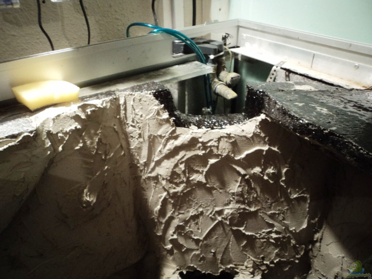 Erst mal zu dem Felsen. Der Felsen ist aus 5 Tonröhren gebaut und steht auf einer 1, 5 cm dicken Plexiglasplatte. Die Ma??e sind b. ca. 40 cm x 40 cm, h. ca. 45 cm. Der Felsen ist mit Aquariumsilikon zusammen geklebt, dann mit Fliesenkleber überzogen. Für die Befestigung der Pflanzen habe ich Edelstahlband mit eingearbeitet wo denn die Pflanzen mit Angelschur festgebunden werden. Der Felsen ist dann mit 3 Schichten Epoxidharz versiegelt. In der Reinfolge hellgrau ??? dunkelgrau & schwarz. [...]
