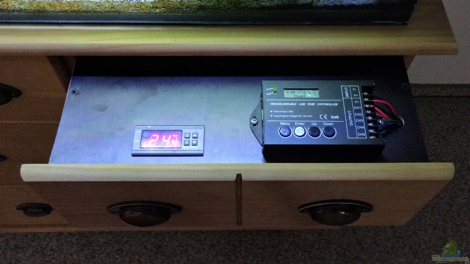 Unter dem Kies befindet sich ein Dennerle ThermoTronic Bodenfluter (Bodenheizung), zu welcher ein Heizstab parallelgeschaltet ist der sich hinter dem Mattenfilter versteckt. ??ber dem Becken hängt ein kleiner Ventilator um eine ??berhitzung des Wassers zu verhindern. Alles zusammen wird über ein Inkbird ITC-2000 Thermostat gesteuert und sorgt relativ problemlos für eine gleichmä??ige Temperatur im Becken.