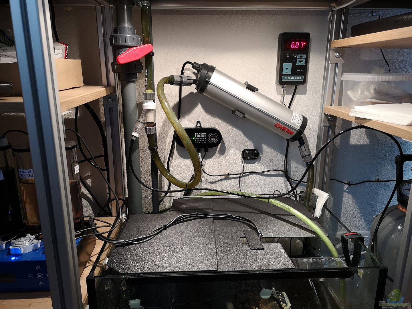 * Heizstab "Tetra HT 300 Watt" * Rückförderpumpe "Tunze silence" mit 3000 Liter/h (real ca. 1500 Liter/h) * Strömungspumpe "Eheim Powerhead aquaball" * UV-Klärer "Eheim Reeflex UV 800" * Luftausströmer "Eheim air pump 400" z. Zt. ausser Betrieb genommen * CO2 Anlage "US Aquaristik" 10 Kg mit Magnetventil * Direktdiffusor "JBL Atomizer" * PH Controller "Ph 201" zur Ansteuerung des Magnetventils * [...]