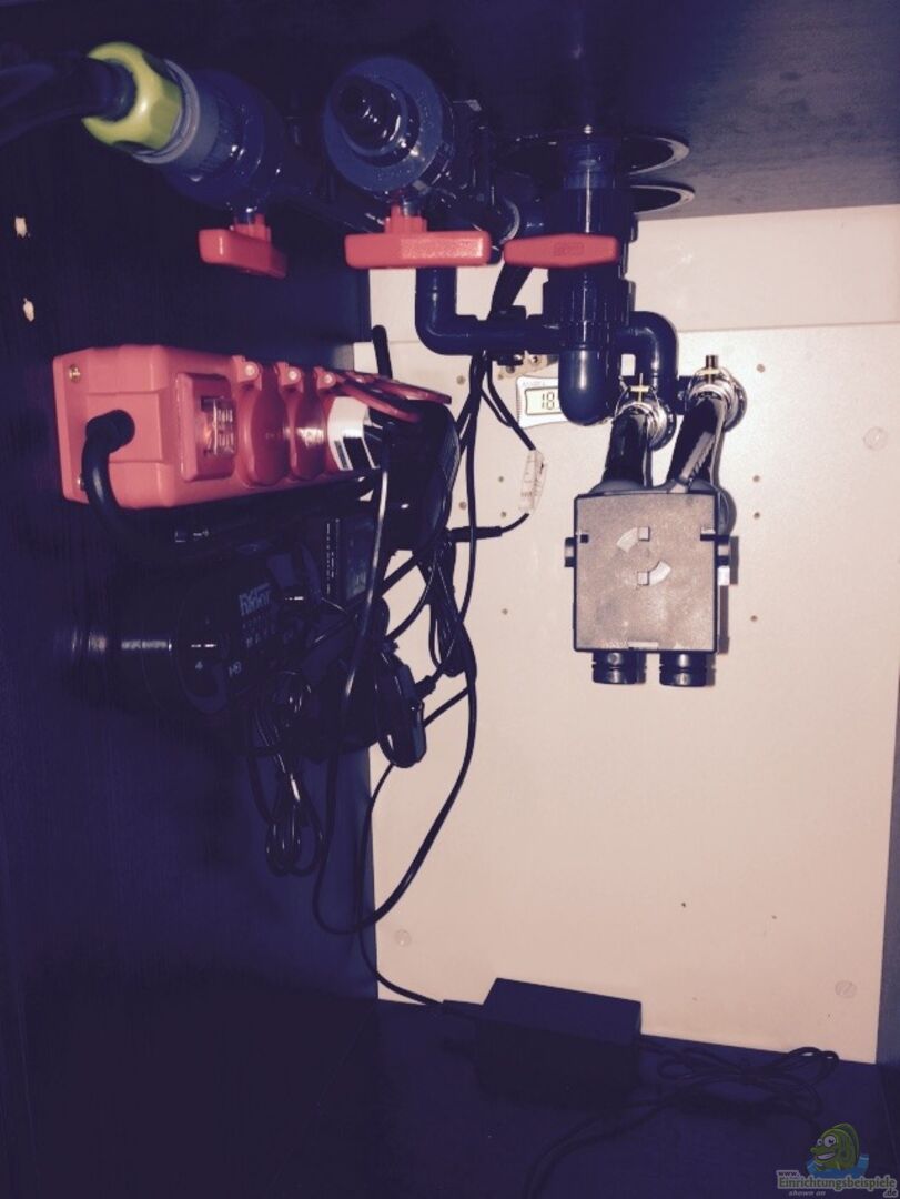Hydor Koralia Smartwave mit 2 Hydor Koralia Nano 1600 l/h Aqua Medic Helix Max UV Klärer 11 Watt EHEIM J??GER thermocontrol Reglerheizer 200 Watt Anstatt dem typischen Filterschlauch habe ich mich für ein PVC Rohrsystem entschieden. Damit lässt sich der wöchentliche Wasserwechsel schnell erledigen.
