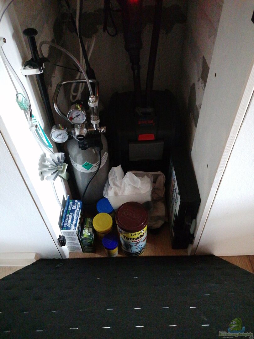 Co2 Anlage mit 2Kg Flasche. Zugeführt wird über einen JBL Taifun Glas Diffusor Maxi. Geheizt wird das Becken über einen JBL Pro Temp e500.