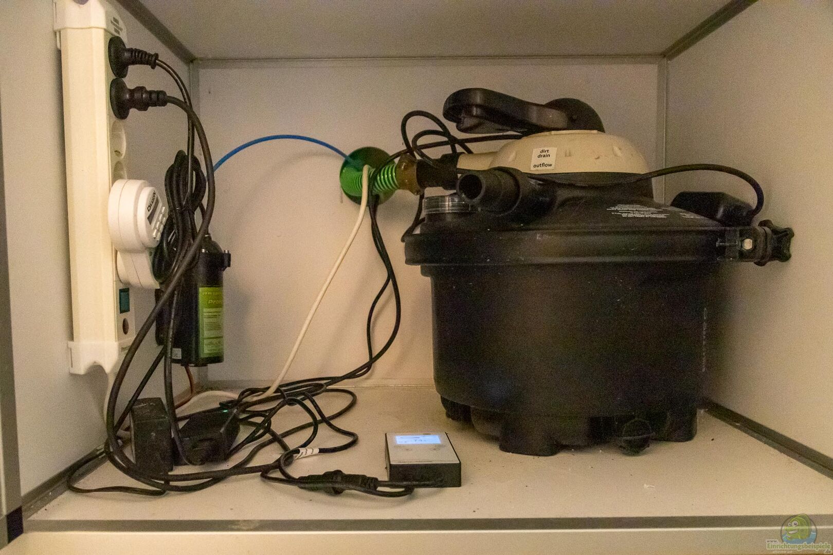 11 Watt Lüfter aus der Haustechnik, läuft mehrmals am Tage für 15 min und sorgt so für Frisch- und Umluft im Landteil; Eine Heizung ist nicht installiert, da das Becken in meinem Krokodilraum steht, der immer mind. 24°C Raumtemperatur hat. Gepaart mit den Lampen und der Pumpe sinkt die Wassertemperatur nicht unter 25°C. In der Regel liegt sie bei 26 bis 27°C. Beregnungsanlage Marke Eigenbau. Schläuche und Fittings sind von der Firma bzo pneumatics, die Feindüsen bekomme ich von einem [...]