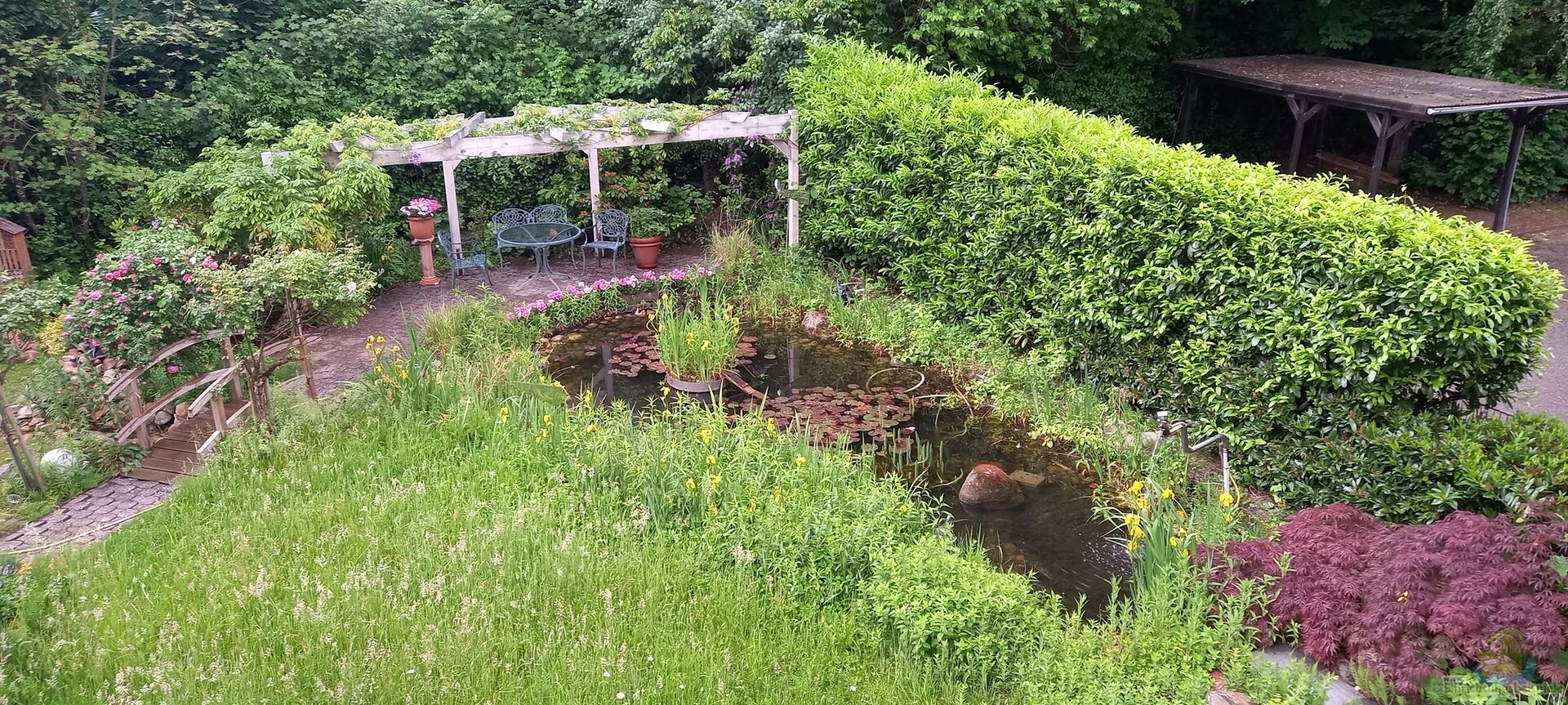 Gartenteich in Nierenform. Damals vom Vater angelegt, lief der Teich lange nur mit einem Eigenbaufilter. Nun hab ich mich der Sache angenommen und den Teich mit einem Druckfilter ausgestattet, der das Wasser über einen neu angelegten Bachlauf zurückführt. In die Teichmitte habe ich noch eine Insel aus Edelstahl gesetzt, die dem Stockentenpaar, dass jeden Frühling bei uns verbringt, als Nistplatz dienen sollte.