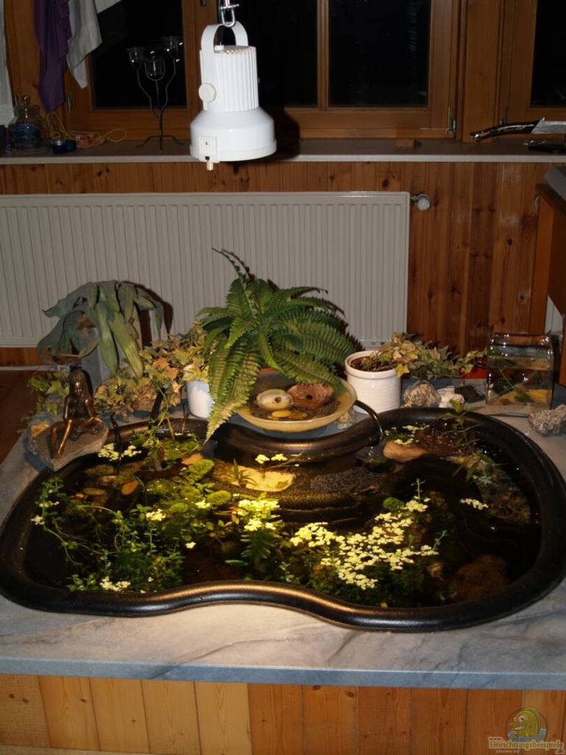 Fertigteich für den Garten, in Holzrahmen eingeschäumt. Steht im Wohn-/Arbeitszimmer. Gesamtgrö??e: 140 x 120 x 46 cm Der Teich ist mit einer ´Ablage´ aus einer Küchenarbeitsplatte umgeben.