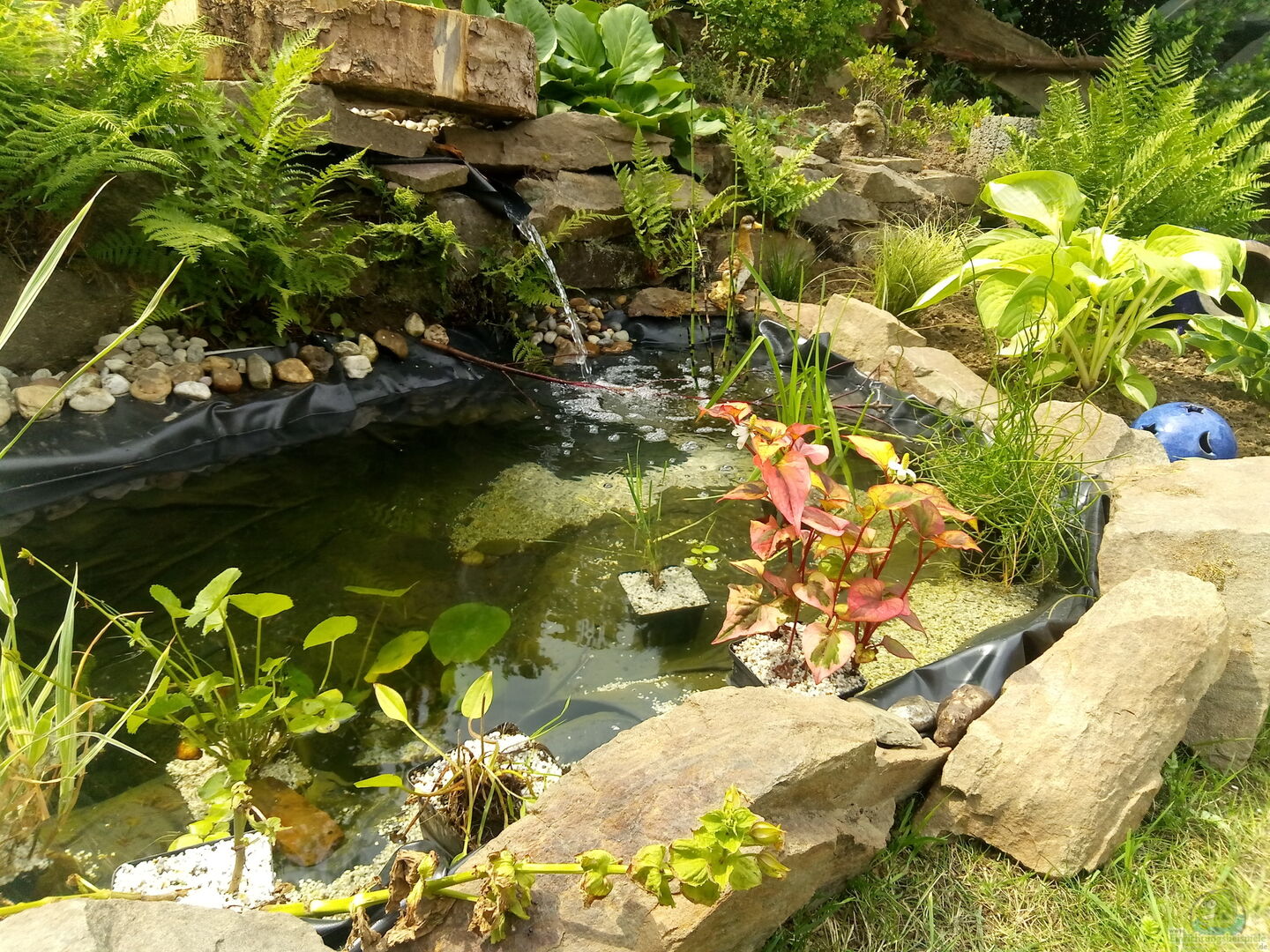 Die Tiefe des Teichs ist in verschiedenen Höhen aufgeteilt. Die Tiefen der einzelnen Podeste varieren von ca. 5 cm bis zur tiefsten Stelle bei rd. 50 cm. Zur Sauerstoffanreicherung habe ich einen Bachlauf im Anhang angelegt, dort flie??st das Wasser mit unterschiedlichen Flie??geschwindigkeiten den Hang ab und landet zuletzt als kleiner Wasserfall in den Teich. Der Teich dient in den Frühjahr bis Herbstmonaten als Projekt in der "Outdooraquaristik". Geplant ist dort Zierfische und [...]
