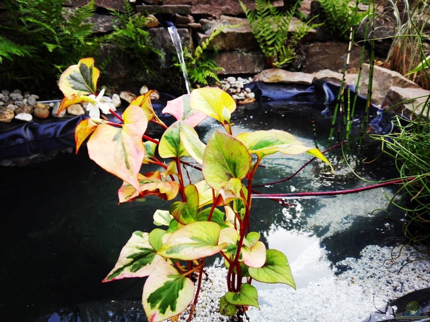 Folgende Pflanzen sind im Becken eingesetzt. Aquariumpflanzen Schwimmpflanze "Limnobium Laevigatum" Seerose "Nymphaea Attraction" Tannenwedel "Hippuris vulgaris" Korkenzieherbinse "Spiralis" "Juncus effusus" Buntgefärbte Houttuynia Chameleon "Houttuynia cordata" Gauklerblume "Mimulus luteus" Grote egelskop "Sparganium erectum Breitblättriger Rohrkolben "Typha latifolia" Buntes Glanzgras [...]
