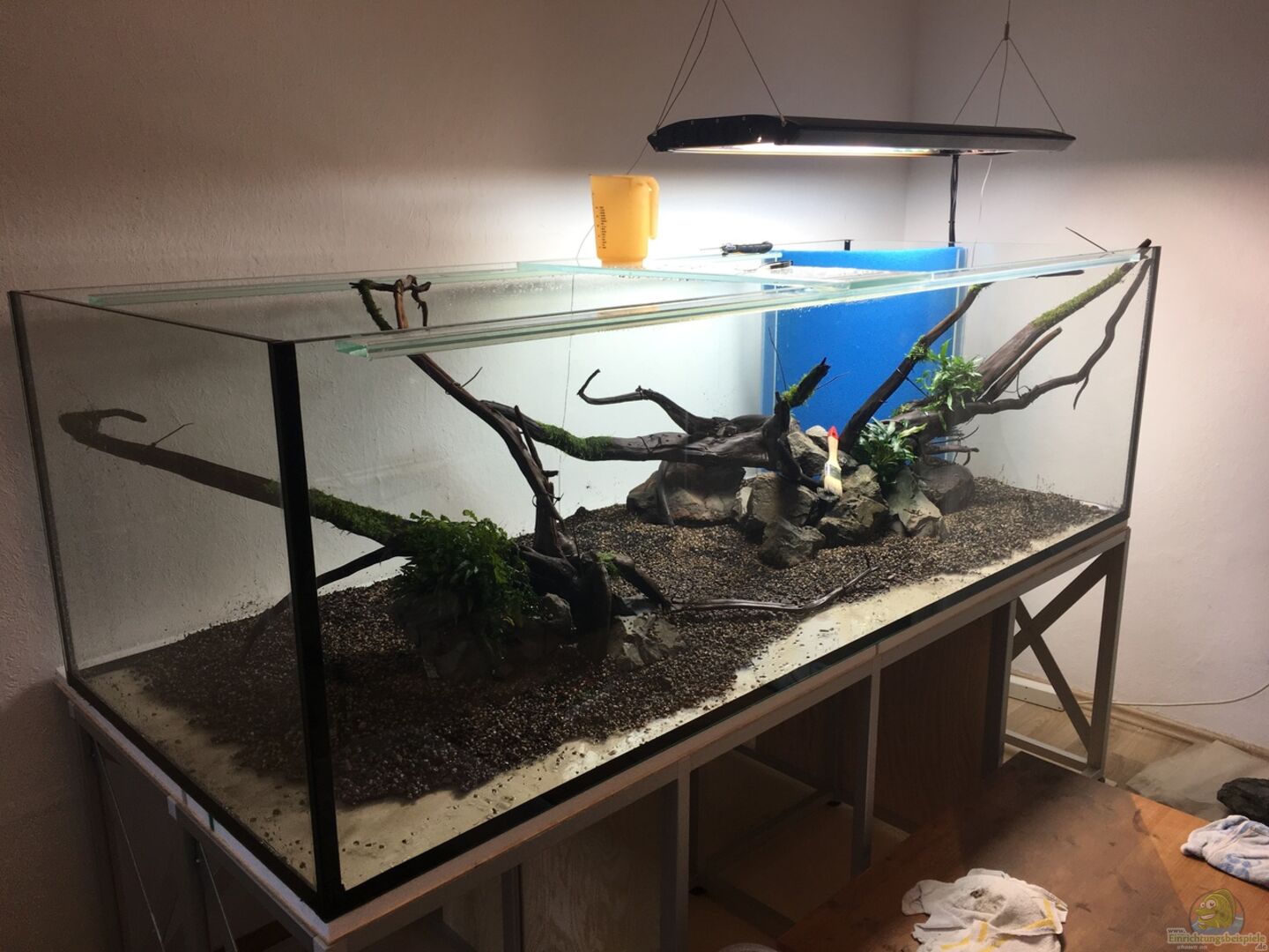 Das Becken ist eine Sonderanfertigung aus 12mm starken Floatglas, diamantgeschliffen und auf Sto?? verklebt. Leer wiegt es 145kg und es dauerte 20min bis es im 3.OG auf dem Schrank stand. Im rechten Bereich wurden jeweils zwei schmale Glasstreifen (Dicke 5mm) zur Aufnahme der Filtermatte des HMF eingeklebt. Zur Stützung der Matte gegen den Kies wurden auf der Bodenplatte senkrecht drei 8cm hohe Gleisstreifen gleicher Dicke geklebt. Zwischen diesen senkrechten ???Platten??? sind Spalte, sodass [...]
