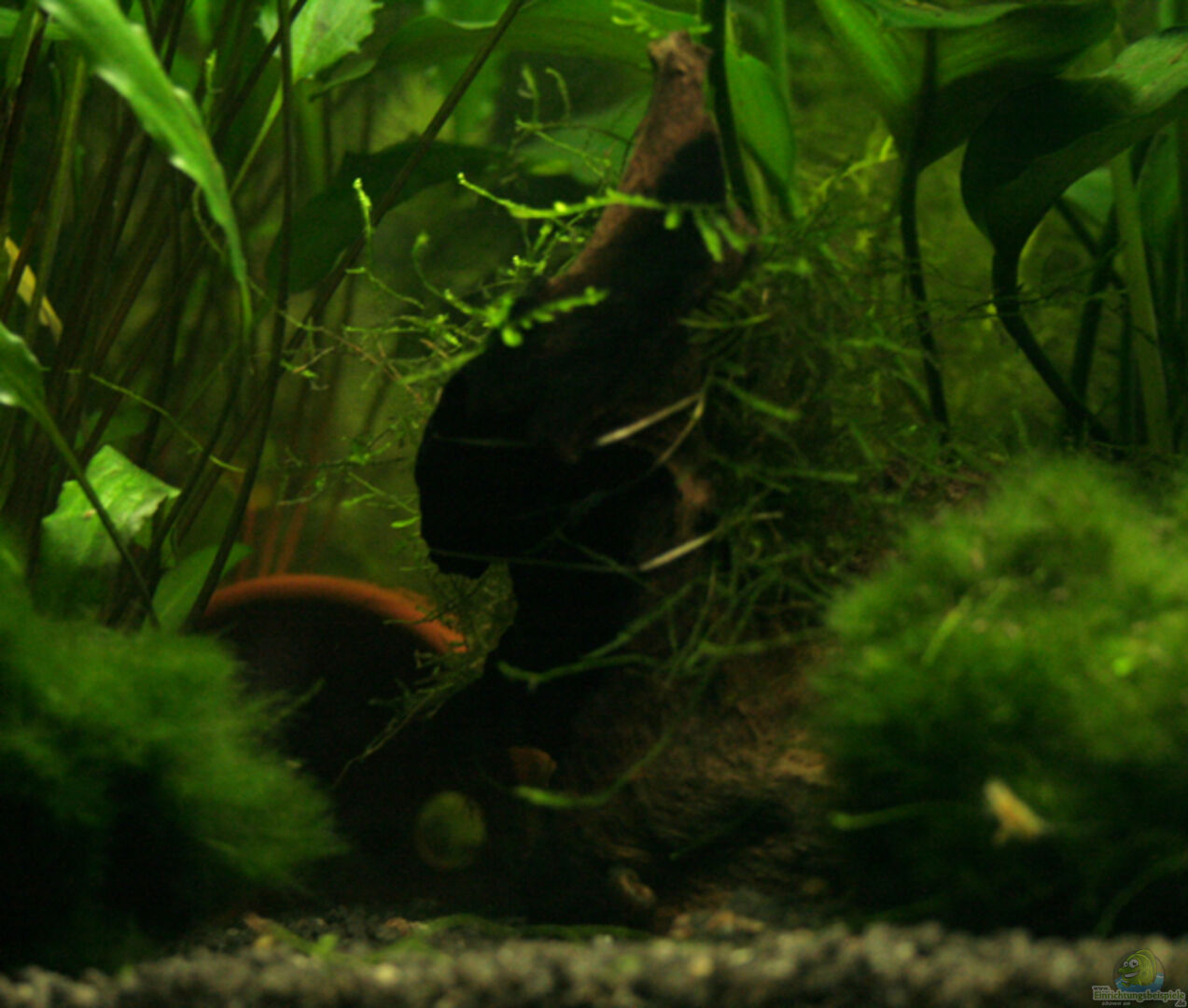 - 2 Wurzenl teilweise mit Javamoos bepflanzt und Höhlen - Einen Steinhaufen aus runden Kieseln für die Pangios (funktioniert prima, deswegen sieht man auch tagsüber keine)