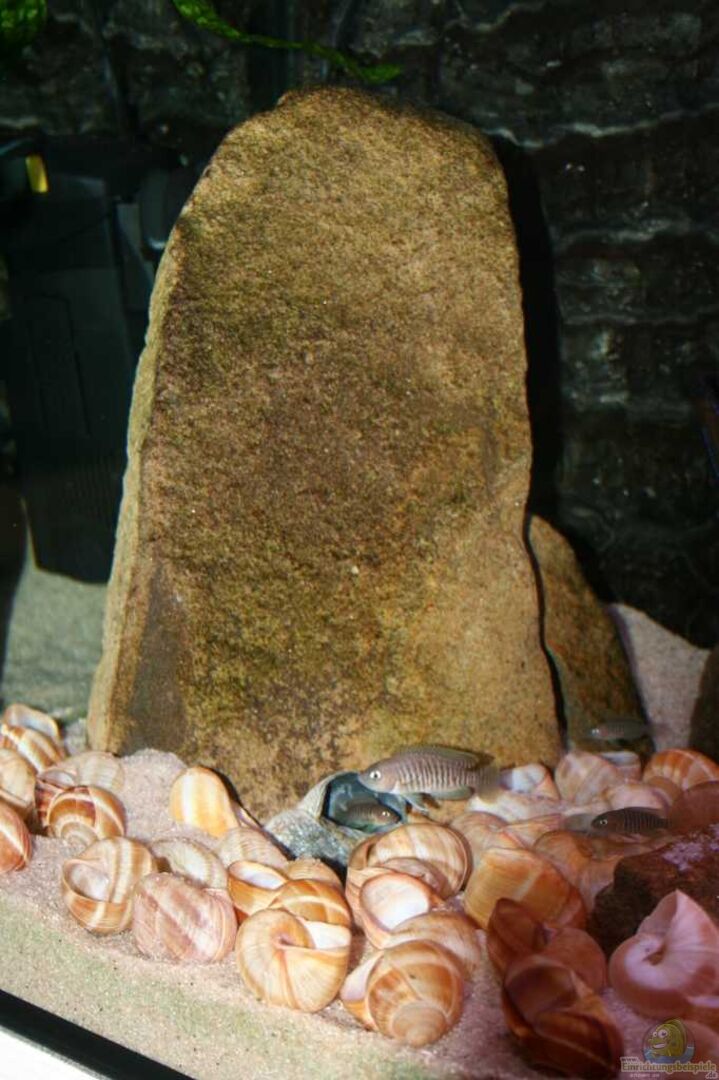 ca. 40 kg Natursteine, die so aufgebaut sind, dass sie für die Fische komplett ´umschwimmbar´ sind. Beim Aufbau habe ich darauf geachtet, dass Sichtbarrieren für die Fische entstehen. Außerdem gibt es viele dunkle Höhlen, senkrechte Steinflächen und einen Steinaufbau bis zur Wasseroberfläche für die Paracyprichromis. Für die Neolamprologus steht ein Schneckenhausbeet und ein paar vereinzelte Schneckenhäuser bereit. Für die Altolamprologus sind zwei größere [...]