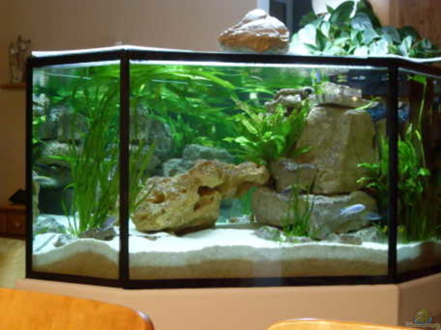 ein etwas anderes Aquarium ( Form ) Sonderanfertigung vom Aquarienbauer in der Nähe . Die Scheiben sind aus 12mm Floatglas und Wulstverklebt ( Nähte innen mit Glasstreifen abgedeckt ). Der Unterschrank ist ein Eigenbau aus Spanplatten und Ytong-Steinen , verkleidet mit Gipsplatten (grün) , nach dem verspachteln mit Streichputz gestrichen und zum Teil mit Antik-Bruchsteinen verkleidet. Die Beckenform hat sich nach langem planen so ergeben und hat sich gut in die Wohnung eingefügt . ===================================================== [...]