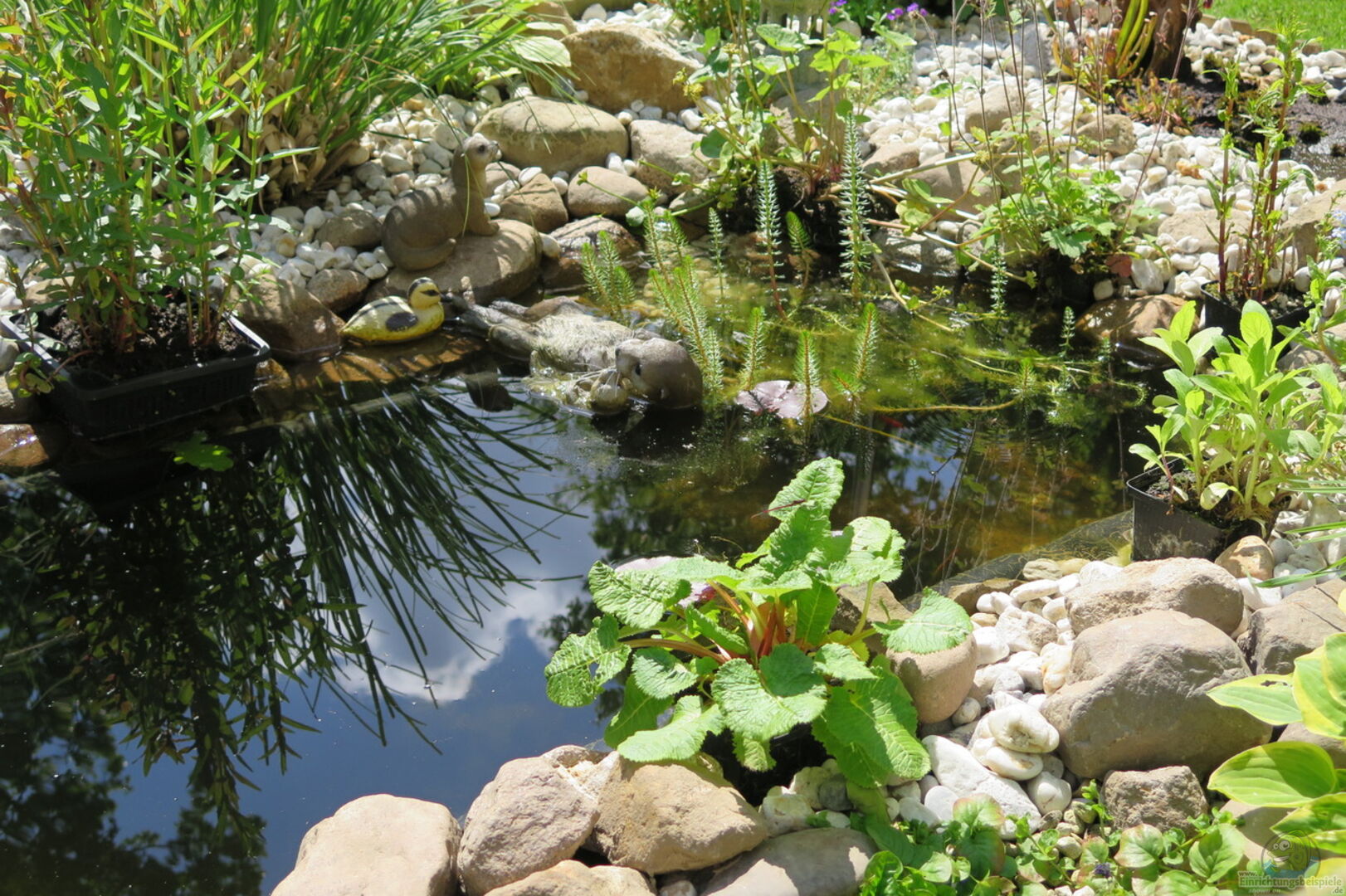Bisher hatten wir einen kleinen 260-Liter-Fertigteich. Dieser wurde uns irgendwann etwas zu klein und so tauschten wir diesen gegen den jetzigen mit einem Volumen von 590 Litern. Viel Wert habe ich darauf gelegt, den unnatürlich wirkenden Plastikrand des Teiches zu kaschieren. An einigen Stellen ist das bereits gelungen, an anderen Stellen fehlen noch ein paar Steine.