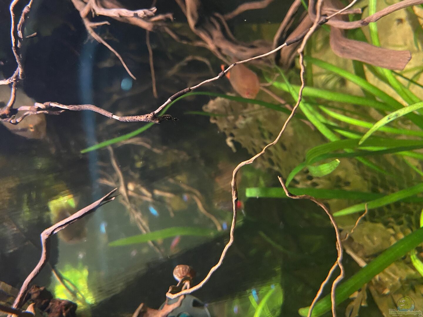 Jede Menge Holz! Das Becken war ursprünglich als unbepflanztes Wurzelbiotop für Geophagus Tapajos Red Head geplant, erwies sich aber auf Dauer als zu beengt für die Erdfresser. Red Heads raus, schon klappts mit den Blümchen, das neue Konzept drehte sich um Südamerikanische Tetras.