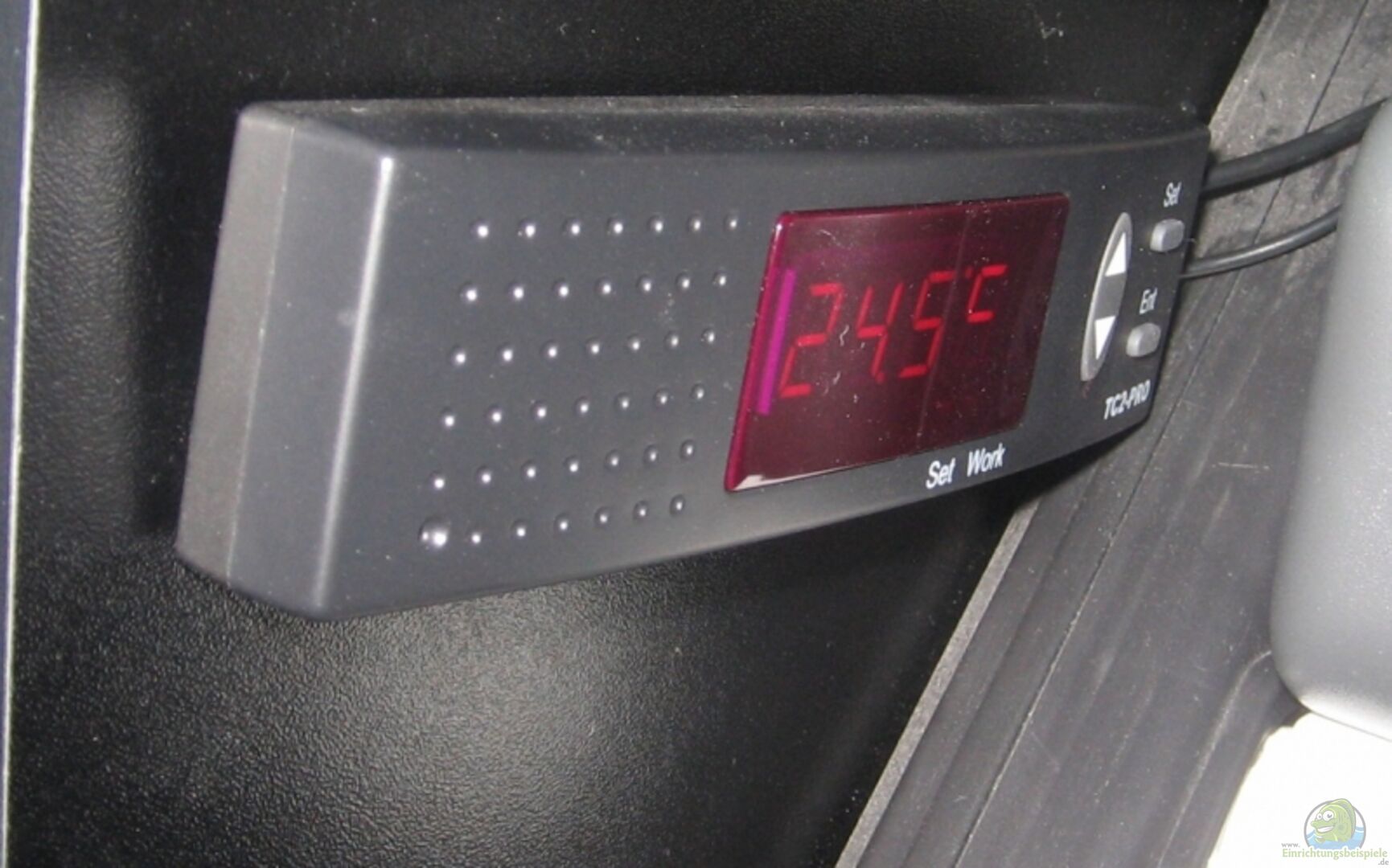 - JBL AquaCleaner - 5 Watt - Juwel 200Watt - Stabheizer (Notheizer bei 22°C) - Jäger: Regelheizer 200 Watt (E3607) (von 8 bis 20 Uhr) - Bodenfluter von Hobby mit 25Watt (24h) - ELITE - Membranluftpumpe (für 120l geeignet - nicht an) - NUTRAFIN CARBO PLUS (läuft auf Stufe 3 von 10) - Thermo Control 2 Pro (TC2 Pro) - Regelt die Heizung - EHEIM Compact 300 - Strömerpumpe (wechselt je Tageszeit) - Lucky Reptile Terra Fan (um Wärmestau zu vermeiden) - 3 x Trust Steckdosenleiste [...]