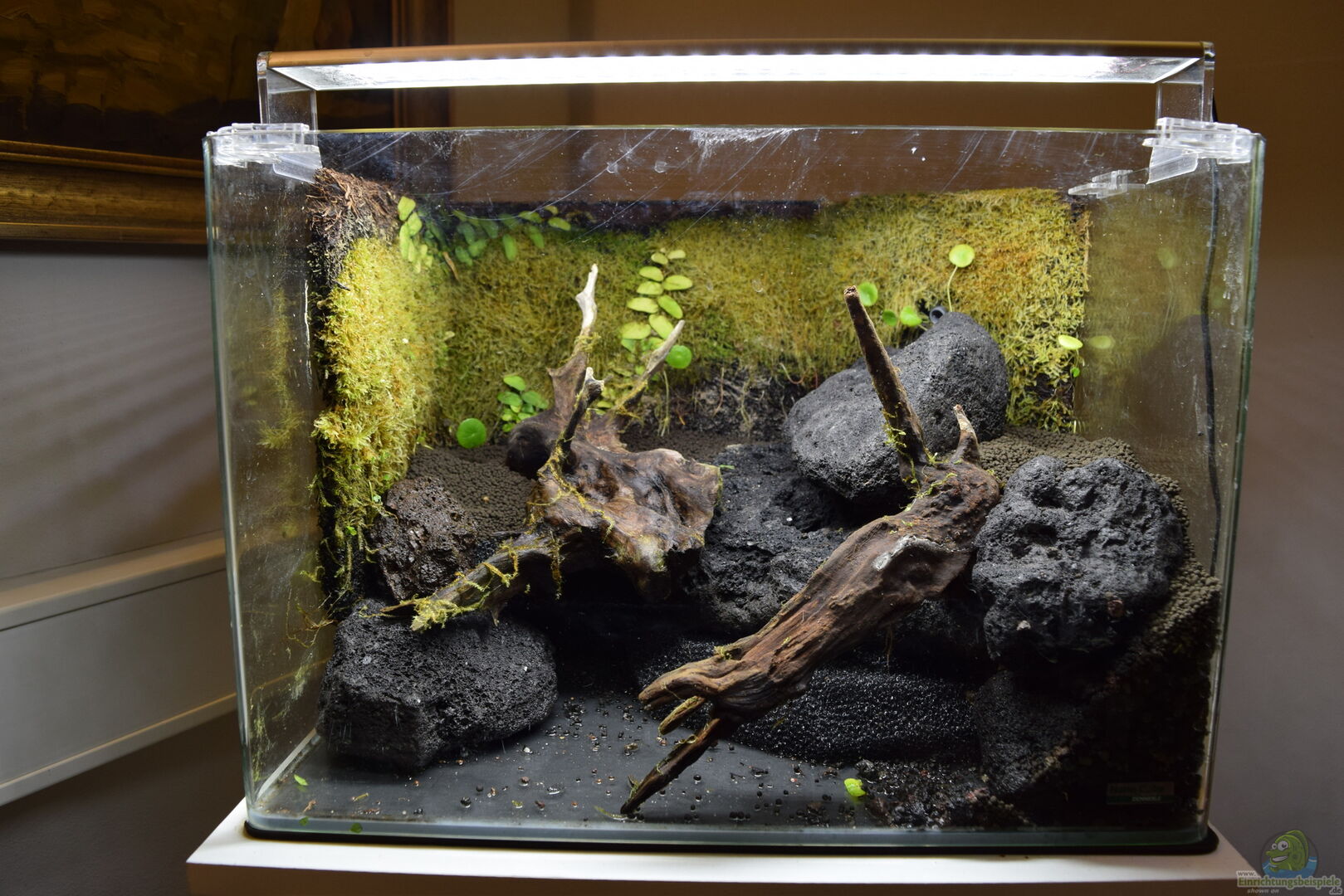 Der Wasserstand diese Beckens beträgt nur knappe 10 cm. Im rechten hinteren Eck befindet sich hinter eine Wand aus Xaxim eine kleine Springbrunnenpumpe, die das Wasser für den Wasserlauf hochpumpt.