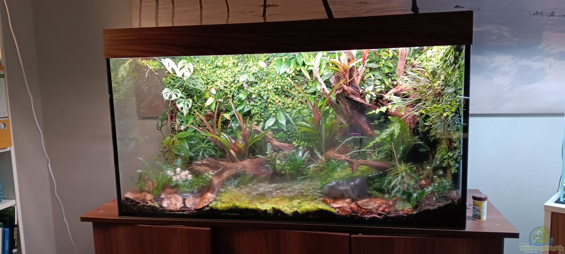 Das Becken hiess vorher "Im Reich der Halbkopfschnäbler und Pferdekopfschmerlen und wurde Anfang dieses Monats umgebaut. Die Fische sind alle gut in meinen anderen Becken untergekommen. Die bewachsene Rückwand des Beckens ist erhalten geblieben und so hoch mit Erde aufgefüllt worden, dass das Xaxim Kontakt mit ihr hat und weiter nass gehalten wird. Die Wurzeln sind also direkt im Wasser hängend auf Erde umgestellt worden. Hatte ein bisschen Angst ob die Umstellung klappt, aber bisher bleiben [...]