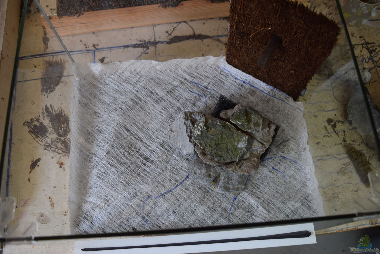 Die Besonderheit bei diesem Becken besteht aus einem Fehlboden, der als Wasserspeicher dient. Der ganze Aufbau steht auf einem Konstrukt aus Lichtstegplatten. Die Technikkammer, wenn man diese so nennen will, ist durch eine eingeklebte Xaximplatte kaschiert. Fliegengitter und Vlies liegen auf den Lichtstegplatten, um so eine Vermischung mit dem Substrat zu verhindern.
