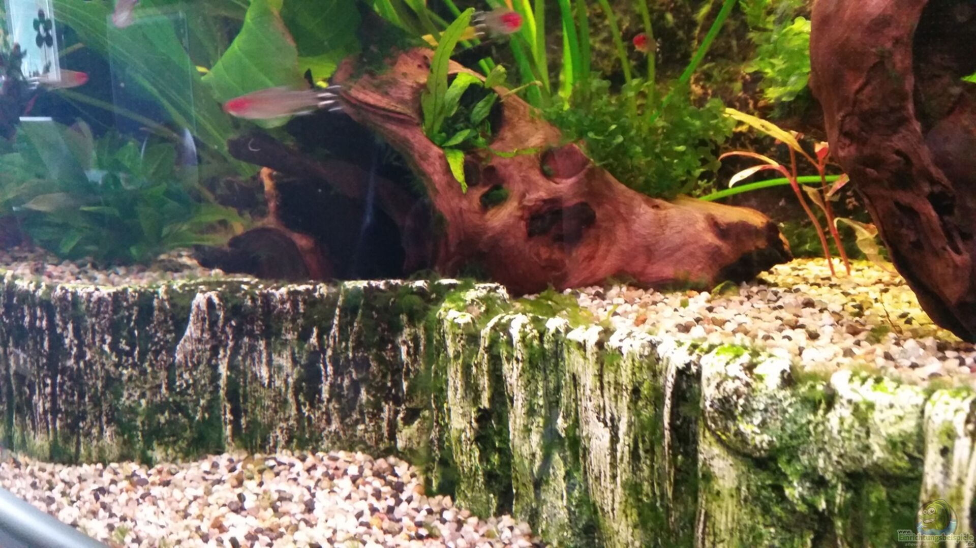 Im vorderen Drittel ist über die ganze Länge eine 9 cm hohe Terrasse eingeklebt. An der hinteren Scheibe ist eine 3D Profil / Strukturrückwand in Stein bzw. Felsoptik eingeklebt. Eine mit Javafarn und Sü??wassertang bepflanzte Wurzel ist im rechten Drittel bis zur Mitte eingesetzt. Eine Schieferhöhle mit mehreren Etagen, steht in der rechten Ecke und ist mit Javafarn bepflanzt. Eine Wurzel liegt noch vor der gro??en Amazonas (die war übrig und musste verarbeitet werden)