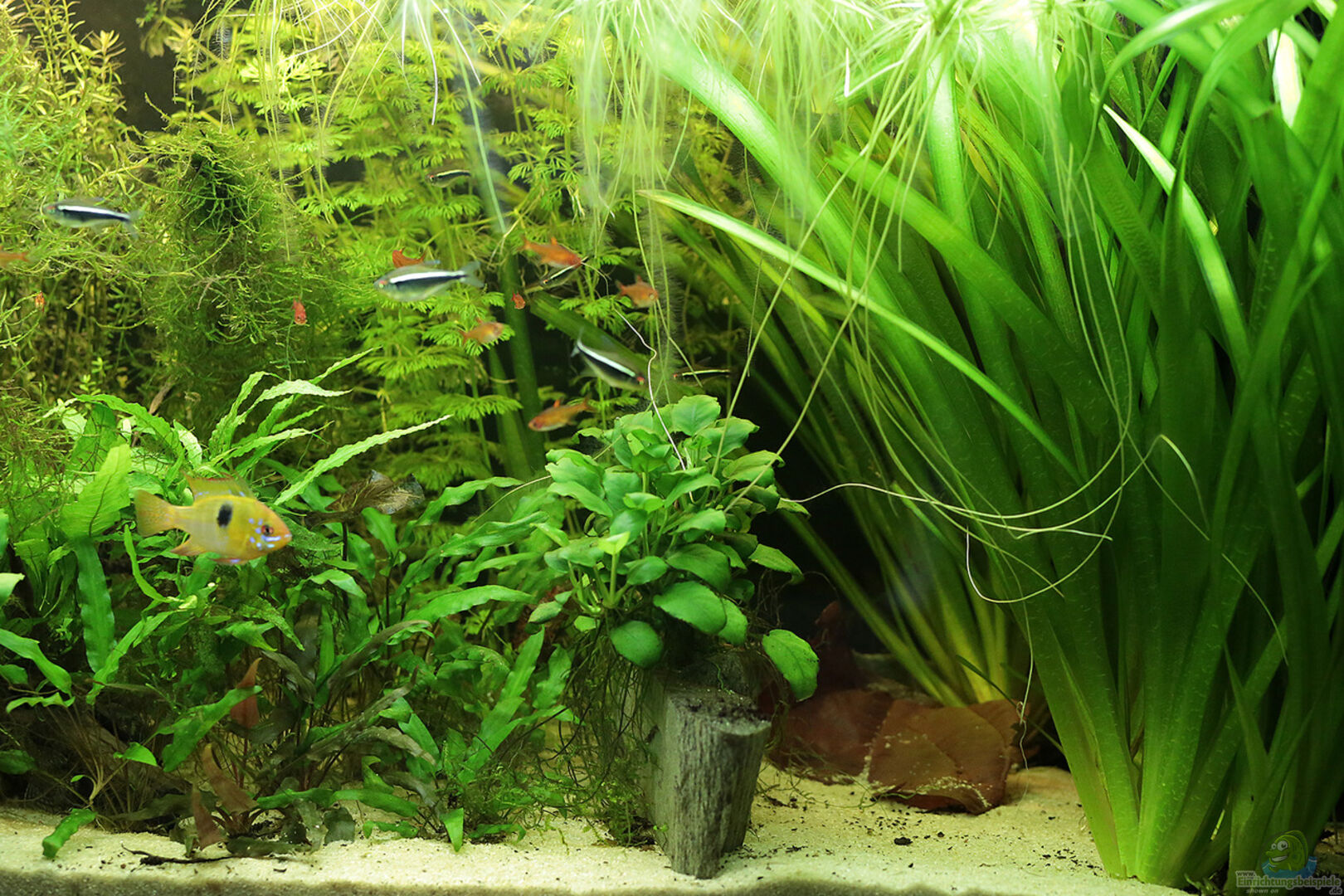 In der Beckenmitte wurden zwei Morkienwurzeln zusammengesetzt, auf denen Anubias, Microsorium pteropus und Javamoos aufgebunden sind. Die Wurzeln der Anubias und des Javafarns bilden sehr schöne Verstecke und Ruheplätze, besonders für die Panzerwelse. Zwei graue Schiefersteine (auf Styropor geklebt) bilden auf der linken Seite eine kleine Terrasse, auf der Anubias wächst. Links von dieser wachsen Cryptcorynen, auf der anderen Seite ist eine kleine freie Sandfläche. Rückwand: Schwarzes [...]