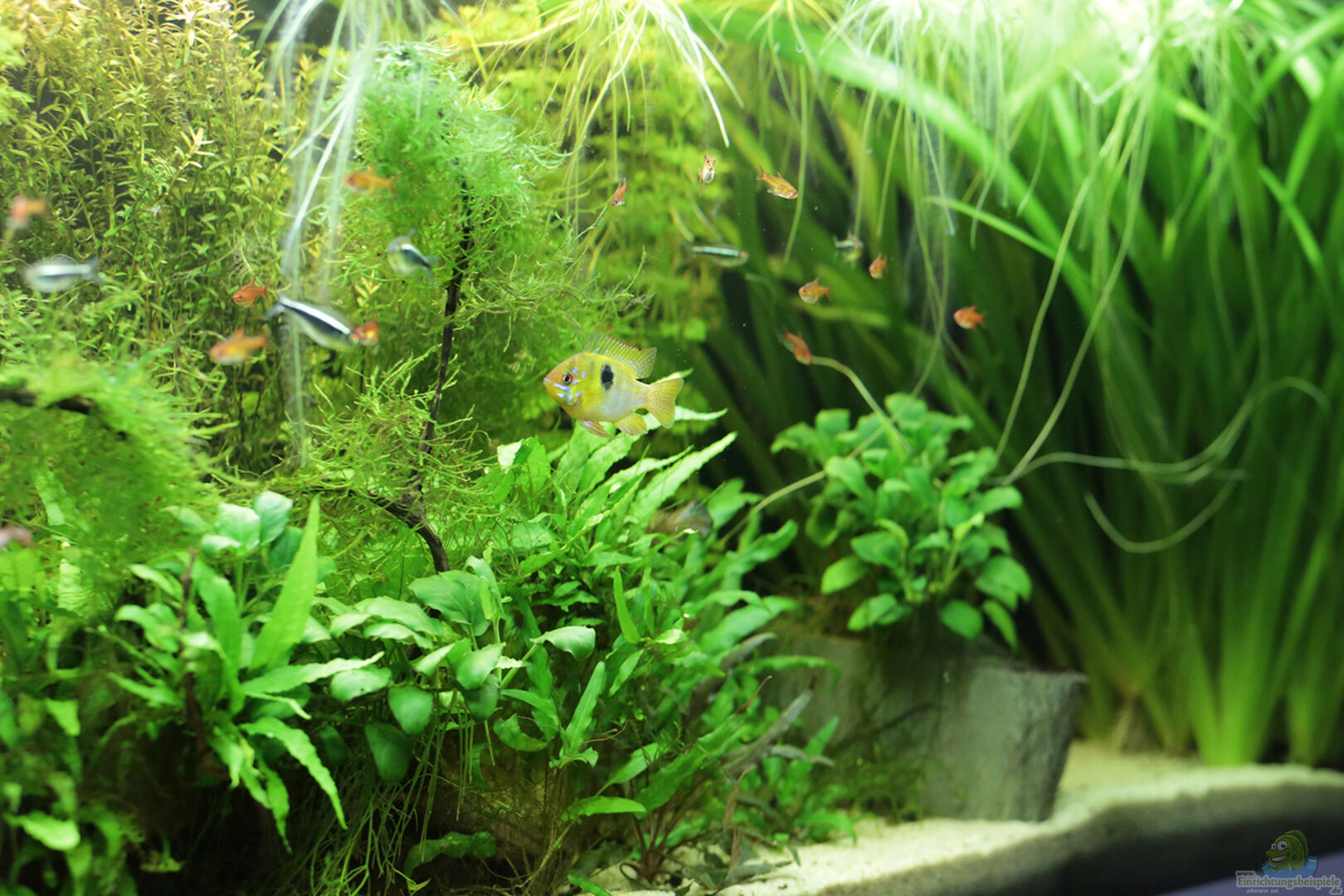 In der Beckenmitte wurden zwei Morkienwurzeln zusammengesetzt, auf denen Anubias, Microsorium pteropus und Javamoos aufgebunden sind. Die Wurzeln der Anubias und des Javafarns bilden sehr schöne Verstecke und Ruheplätze, besonders für die Panzerwelse. Zwei graue Schiefersteine (auf Styropor geklebt) bilden auf der linken Seite eine kleine Terrasse, auf der Anubias wächst. Links von dieser wachsen Cryptcorynen, auf der anderen Seite ist eine kleine freie Sandfläche. Rückwand: Schwarzes [...]