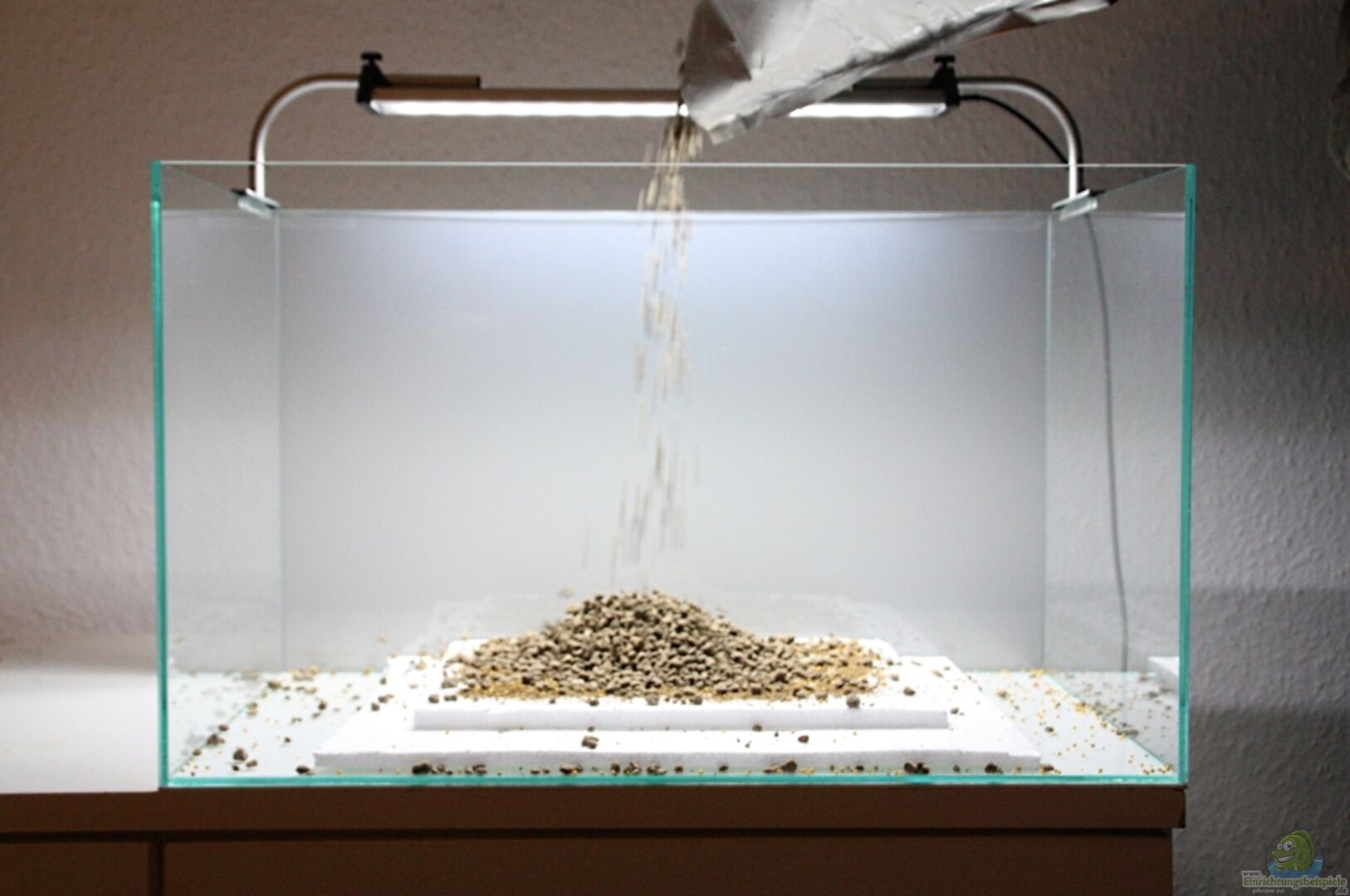 -ein sehr schönes, transparent verklebtes Poolaquarium (ohne Streben). Die Nähte sind nur hauchdünn verklebt. -Als Hintergrundfolie eine Milchglaslampenschirmfolie aus dem Bastelgeschäft. -Auf Empfehlung von Herrn Just hab ich statt Styropor nun eine wei??e Moosgummiplatte unter dem Becken. Hier gibt es eine detaillierte Fotostrecke zum Aufbau: