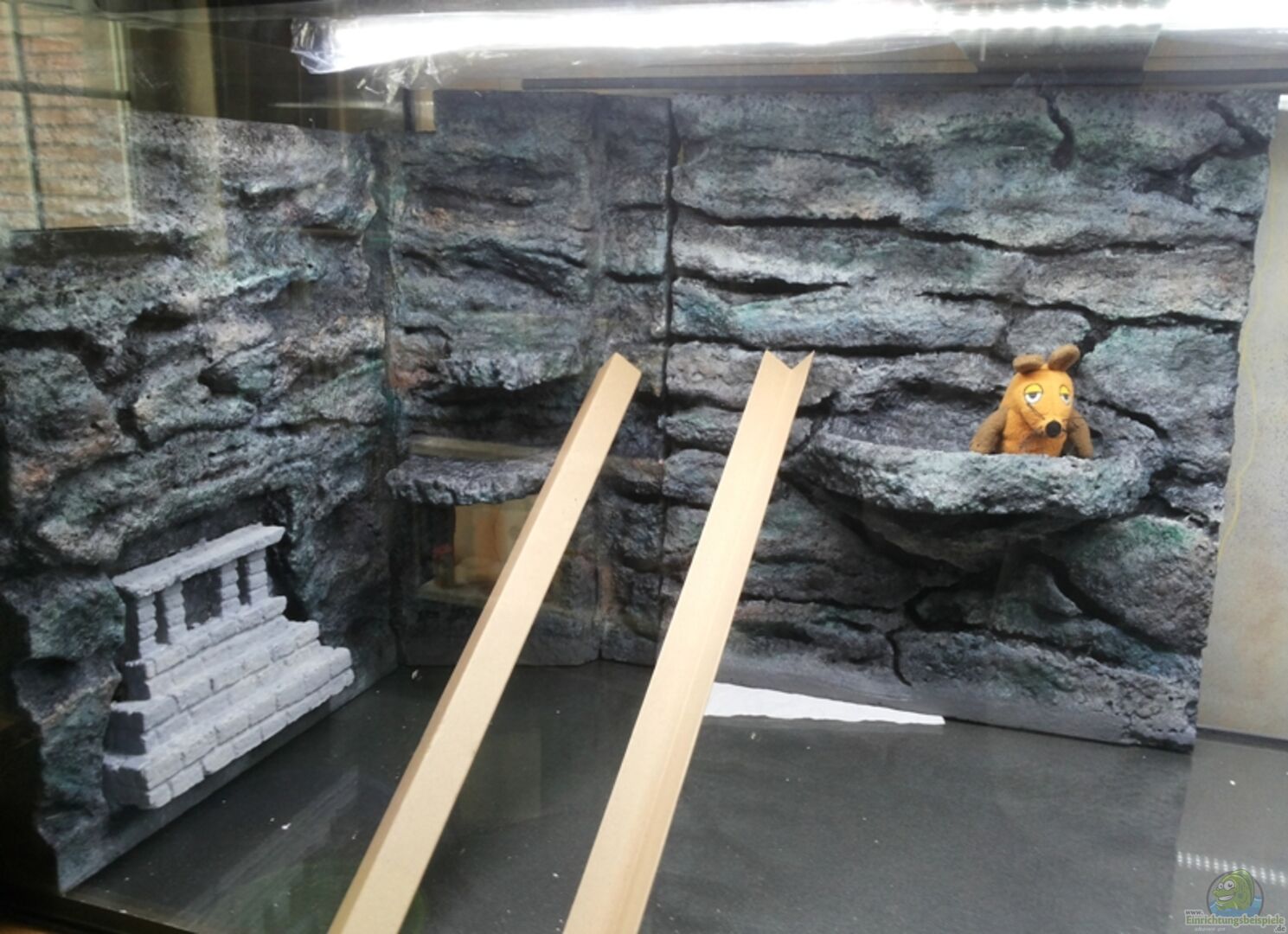 Selbstgebaute Rück- und Seitenwand. 5 cm dicke Styroporplatten wurden im ersten Arbeitschritt auf die passenden Ma??e zurechtgeschnitten, im nächsten Schritt das Design mit Filzstift grob markiert. Danach wurden die Vertiefungen herausgeschnitten und gekratzt (sehr mühsame und viele statisch aufgeladene Styroporbröckchen verursachende Arbeit). Die groben und noch sehr unnatürlich wirkenden Formen wurde durch Bearbeiten mit einem Hei??luftfön etwas geglättet und vertieft. Neben der Rückseite [...]
