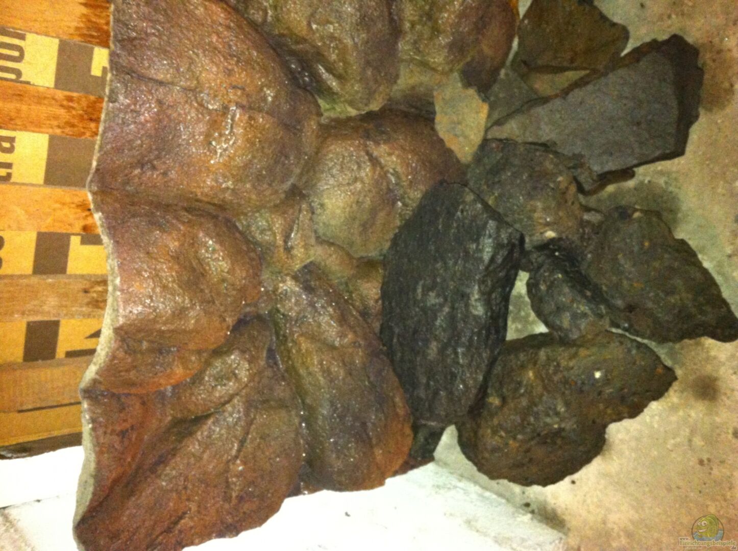 3 D Rückwand Felsen aus Schaum, abgedichtet mit Epoxidharz, verfeinert mit kleinen Steinchen an manchen Felsenspalten. Basaltgestein aus der Vulkaneifel, selbst gesammelt aus einem Steinbruch. Künstliche Steine auch aus dem Material der Rückwand bieten gerade dem Nachwuchs schöne Rückzugsmöglichkeiten weil sie innen hohl sind. Das lieben die Yellows und die mbamba bays und nutzen es auch zum balzen..