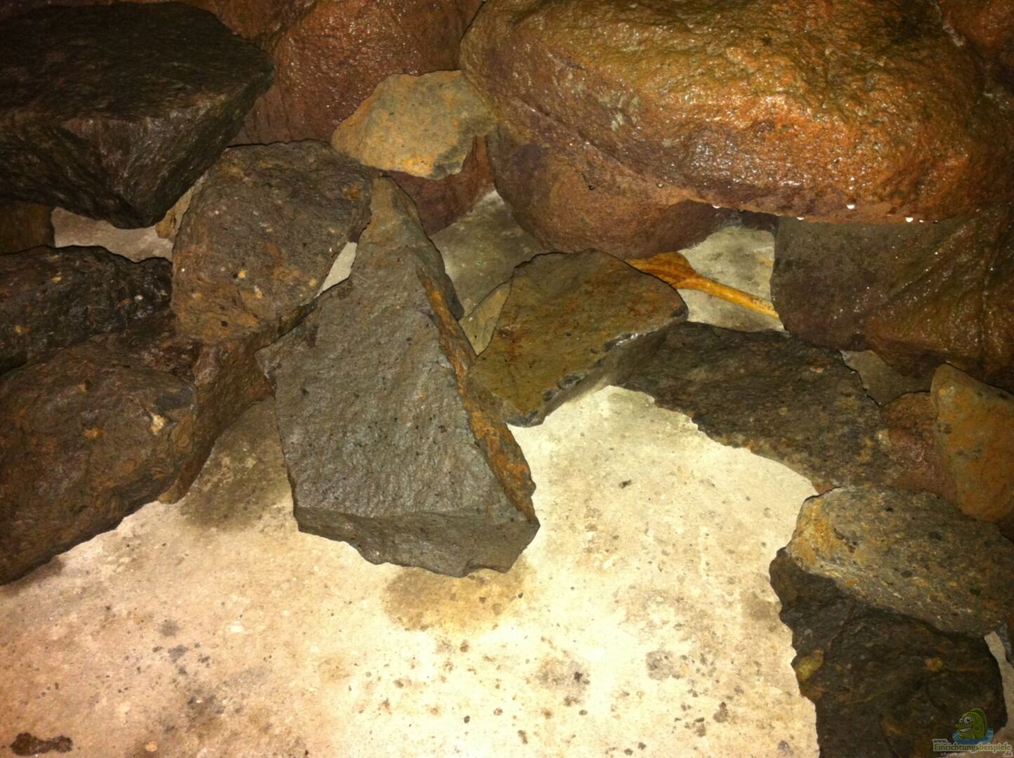 3 D Rückwand Felsen aus Schaum, abgedichtet mit Epoxidharz, verfeinert mit kleinen Steinchen an manchen Felsenspalten. Basaltgestein aus der Vulkaneifel, selbst gesammelt aus einem Steinbruch. Künstliche Steine auch aus dem Material der Rückwand bieten gerade dem Nachwuchs schöne Rückzugsmöglichkeiten weil sie innen hohl sind. Das lieben die Yellows und die mbamba bays und nutzen es auch zum balzen..