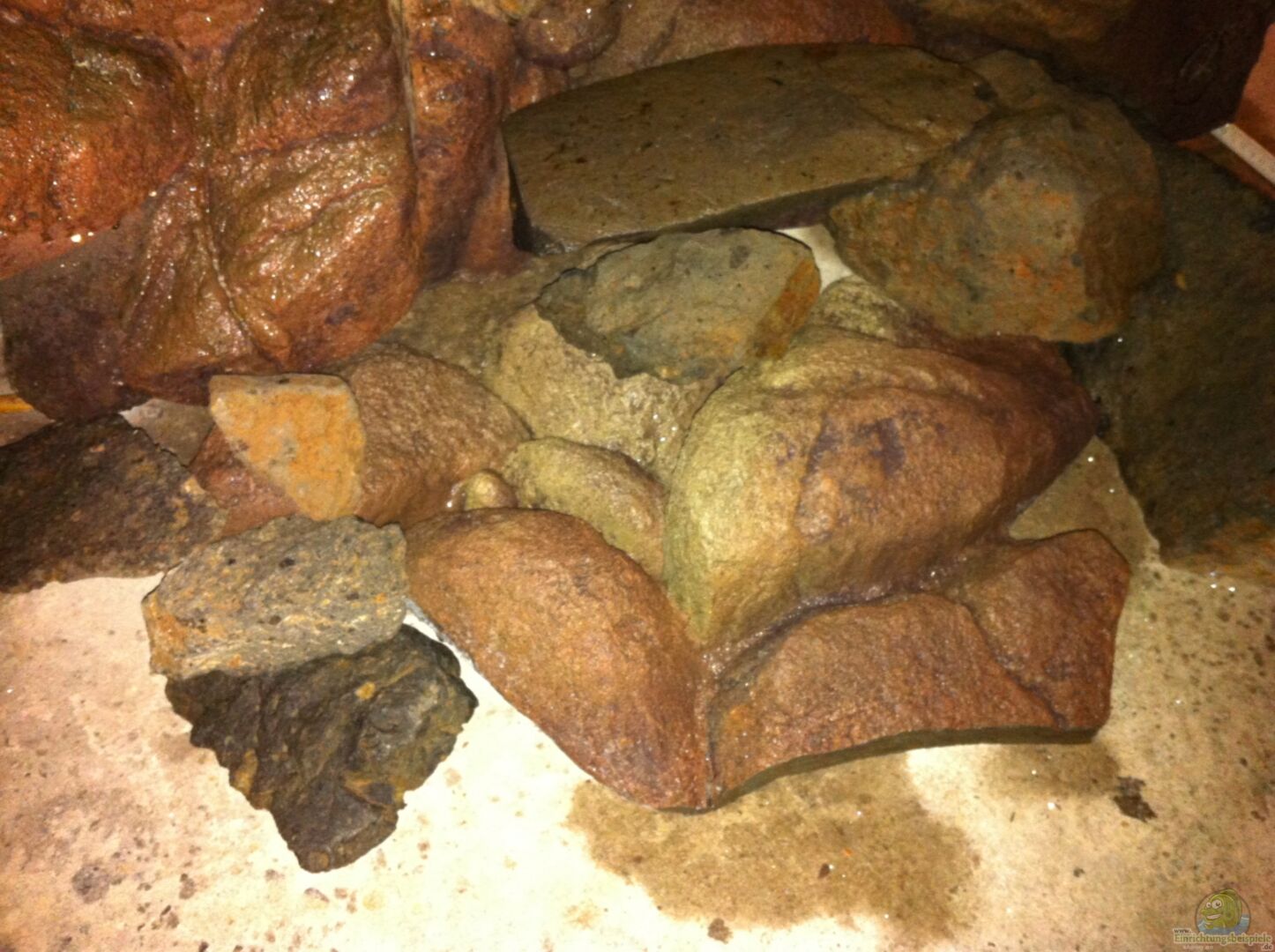 3 D Rückwand Felsen aus Schaum, abgedichtet mit Epoxidharz, verfeinert mit kleinen Steinchen an manchen Felsenspalten. Basaltgestein aus der Vulkaneifel, selbst gesammelt aus einem Steinbruch. Künstliche Steine auch aus dem Material der Rückwand bieten gerade dem Nachwuchs schöne Rückzugsmöglichkeiten weil sie innen hohl sind. Das lieben die Yellows und die mbamba bays und nutzen es auch zum balzen..
