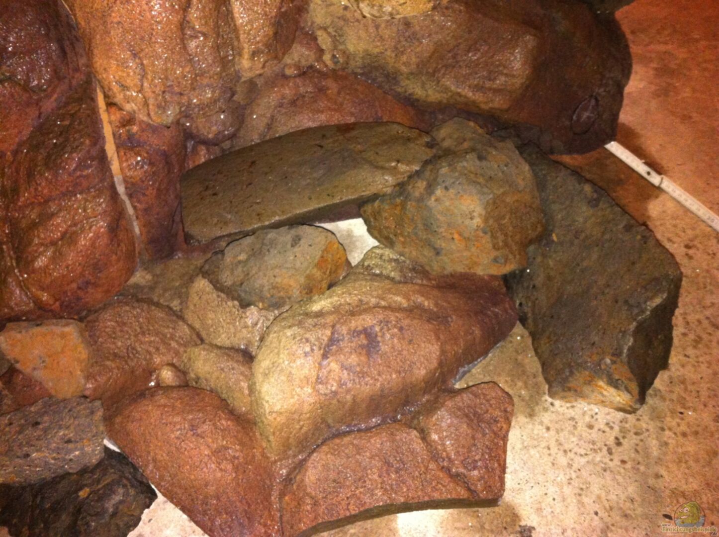 3 D Rückwand Felsen aus Schaum, abgedichtet mit Epoxidharz, verfeinert mit kleinen Steinchen an manchen Felsenspalten. Basaltgestein aus der Vulkaneifel, selbst gesammelt aus einem Steinbruch. Künstliche Steine auch aus dem Material der Rückwand bieten gerade dem Nachwuchs schöne Rückzugsmöglichkeiten weil sie innen hohl sind. Das lieben die Yellows und die mbamba bays und nutzen es auch zum balzen..