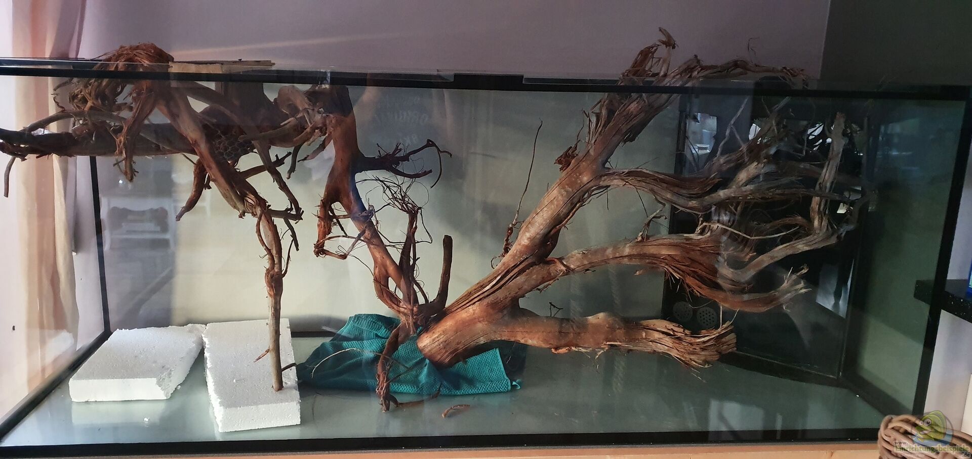 Vier Moorkienwurzeln. Drei kommen von oben und sind über Leisten auf den Streben befestigt. Die Gro??e ist hochgezogen, damit Sie nicht auf dem Boden komplett liegt. 2x Welshöhle Seemandelbaumrinde 6x Tonröhren 1x Moosbrücke 1x Mangrovenwurzel für eine Anubia