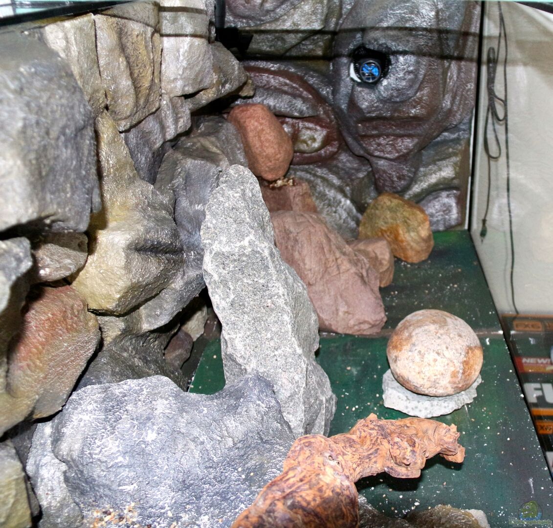 3-teilige Rückwand und rechte Seitenwand sowie 2 Riffplatten in Eigenbau (siehe Block 3) Tiefe der Rückwand 2-16 cm mit vielen Spalten und ??berhängen als Versteckmöglichkeiten. Rockzolid Stone Module D (32x13x13) als hängender Stein unter der Querstrebe Rockzolid River Stone J (56x39x34) ca. 1/3, 2/3 geteilt und ins Becken gestellt um etwas Gewicht zu sparen. In den River Stone Teile sind auf den Rückseiten Aussparungen um als Höhlen zu dienen. Zusätzlich befinden sich noch [...]
