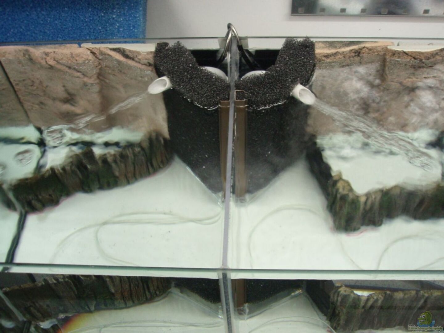 Das Becken hat in der Mitte eine eingeklebte Trennwand. Somit ergeben sich pro Seite ein Volumen von 27 Ltr.