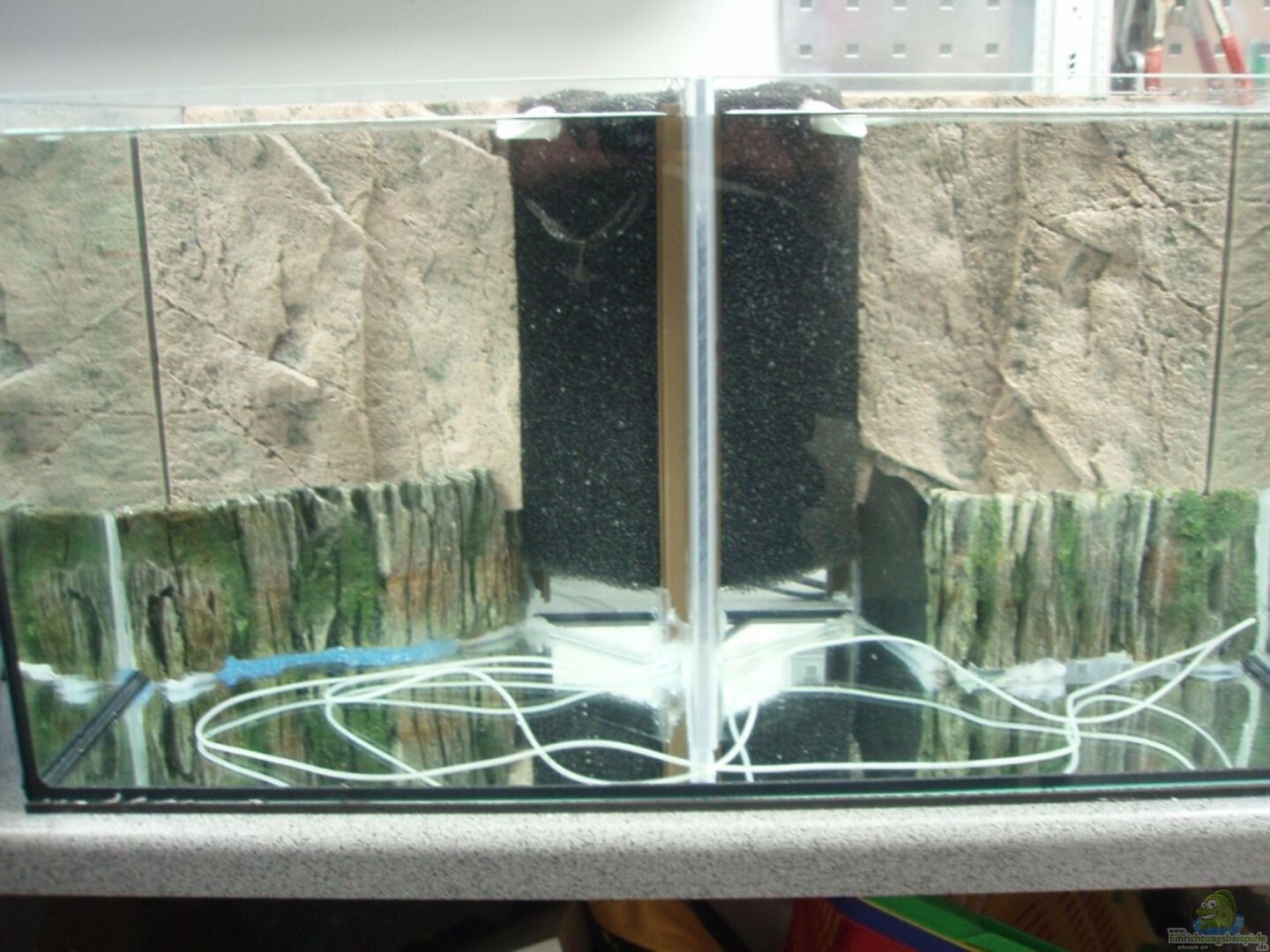 Das Becken hat in der Mitte eine eingeklebte Trennwand. Somit ergeben sich pro Seite ein Volumen von 27 Ltr.