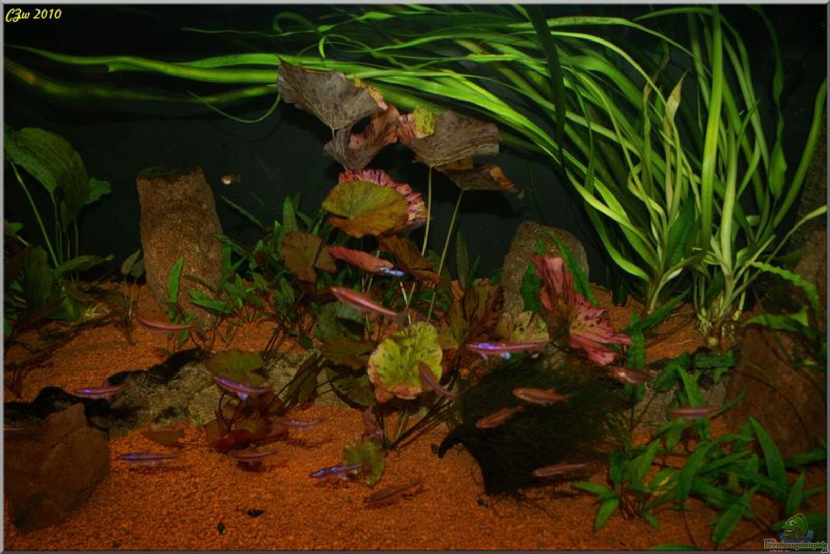 Anubias barteri var. nana, Crytocoryne walkeri Crytocoryne wendtii braun Echinodorus ???Red Flame???, Hygrophila difformis Hygrophila siamensis Limnophila sessiliiflora Lobelia cardinalis Bund Ludwigia repens Javamoos (auf Wurzel und auf Kokosnussschale aufgebunden) Crinum thaianum 1 Tiger Lotus (rot) Knolle (Versuch) Düngung per CO2 sowie 1x wöchentlich mit HappyLife Happyplant Evolution und 1x wöchentlich mit EasyLife Profito