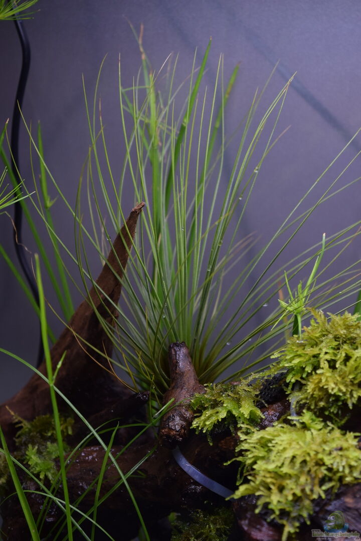 Cyperus zumula (Katzengras), Cyperus haspan, Eleocharis Xingu, emers vorgezogenes Javamoos und Leptodictyum riparium, Salvia natans, Microgramma vaccinifolia, Neoregelia Akeso, Vriesea correia aurajoi, Tillandsia festucoides,