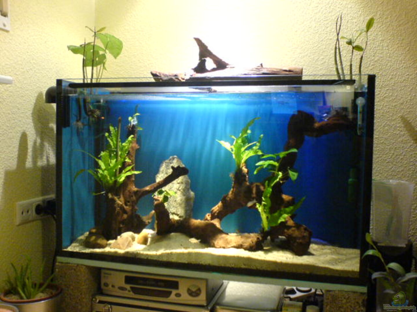 Ist eigentlich mein Altes Osmosewasser-reife-becken, Rückwand u.Seitenscheiben sind mit blauer Abtönfarbe gestrichen, vorne links (linke seitenscheibe bohrung von altem Osmosewasser-zulauf) Sonderanfertigung 10mm