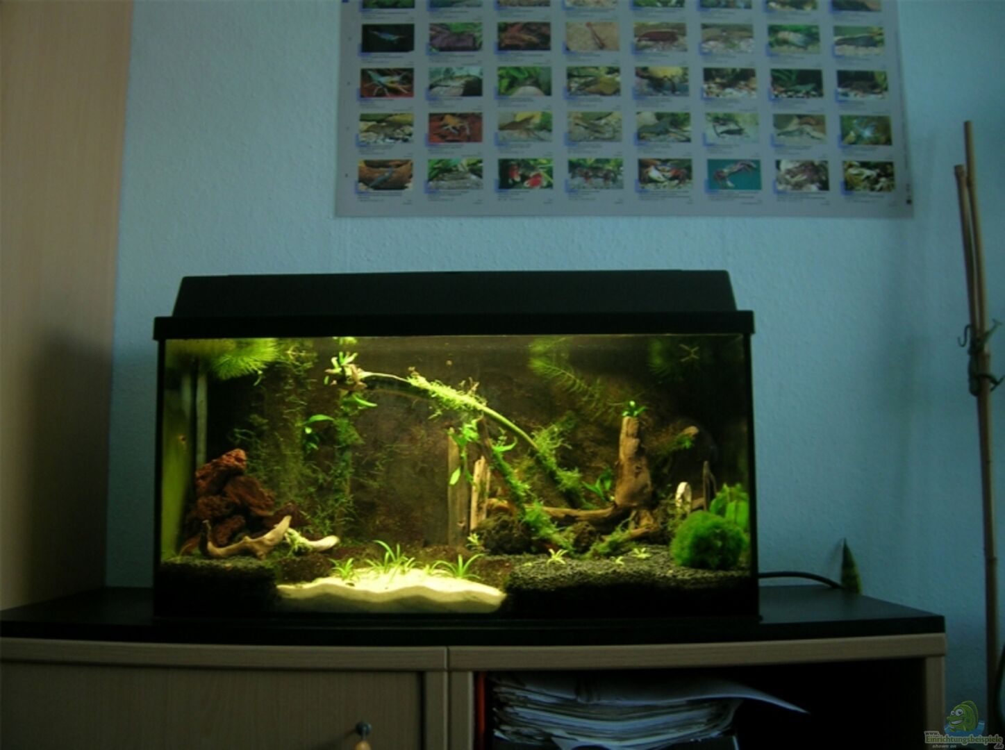 Standart Juwel Becken läuft seit Juni 07. Die Rückwand und die Terassen sind selbstgebaut (nach Internetanleitungen). Die beiden Terassen sind so angeordnet, dass sich eine Art nach hinten verjüngende Bucht ergibt. Durch die ??ffnung nach vorne ergibt sich, dass sich der komplette Sandbereich in einem Winkel von bis zu 90° betrachten lässt. (Herstellung siehe Blog)