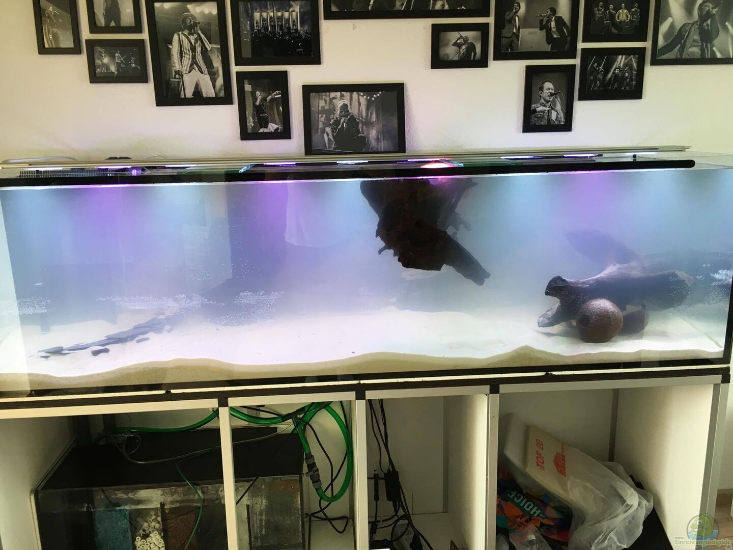 Ma??anfertigung in 10mm Glas, ??berlaufschacht und vier Bohrungen (drei für Filterschacht und eine au??erhalb des Schachtes für Wasserwechsel) Unterbau wurde aus Aluprofilen von MarineSystems gebaut, darunter und darauf eine 3cm Schalungsplatte und Styropor zur Lastverteilung. Verkleidet wurde das Becken durch Möbelbauplatten Die Abdeckung wurde von einem Aquarienbauer auf Ma?? gefertigt.