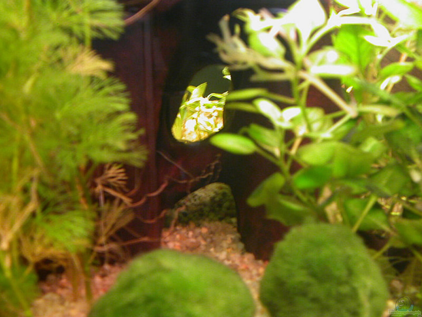 Hintergrundfolie (blau mit Pflanzen und Steinen) zwei sehr gro??e Mangrovenwurzeln mehrere rötliche Flusssteine vorne mitte zwei schwarze Flusssteine links vorn eine Kokosnusshöhle (hat Papa selbst gebaut :-))
